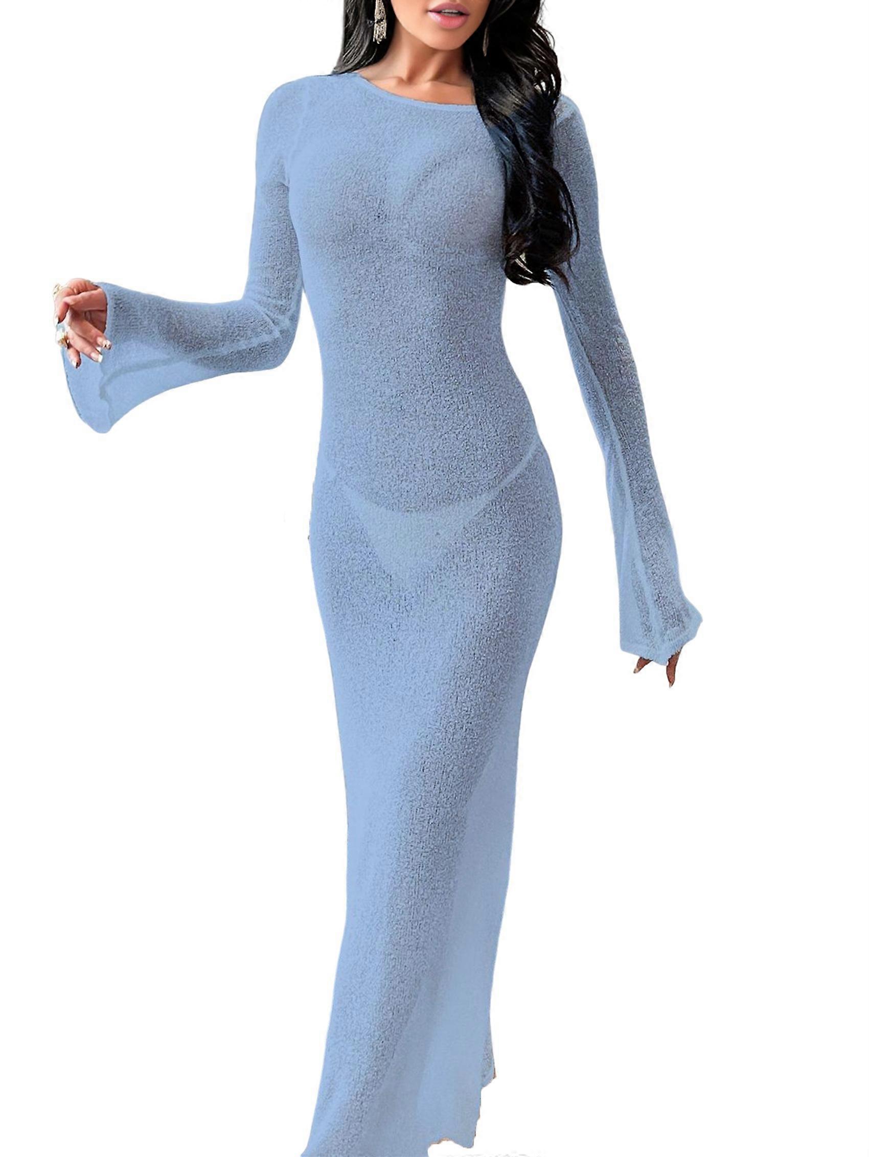 Women'S Crochet Cover-Up Long Sleeve Mesh Open Back Knit Swimsuit Cover-Up Beach Maxi Dress Light Blue XL