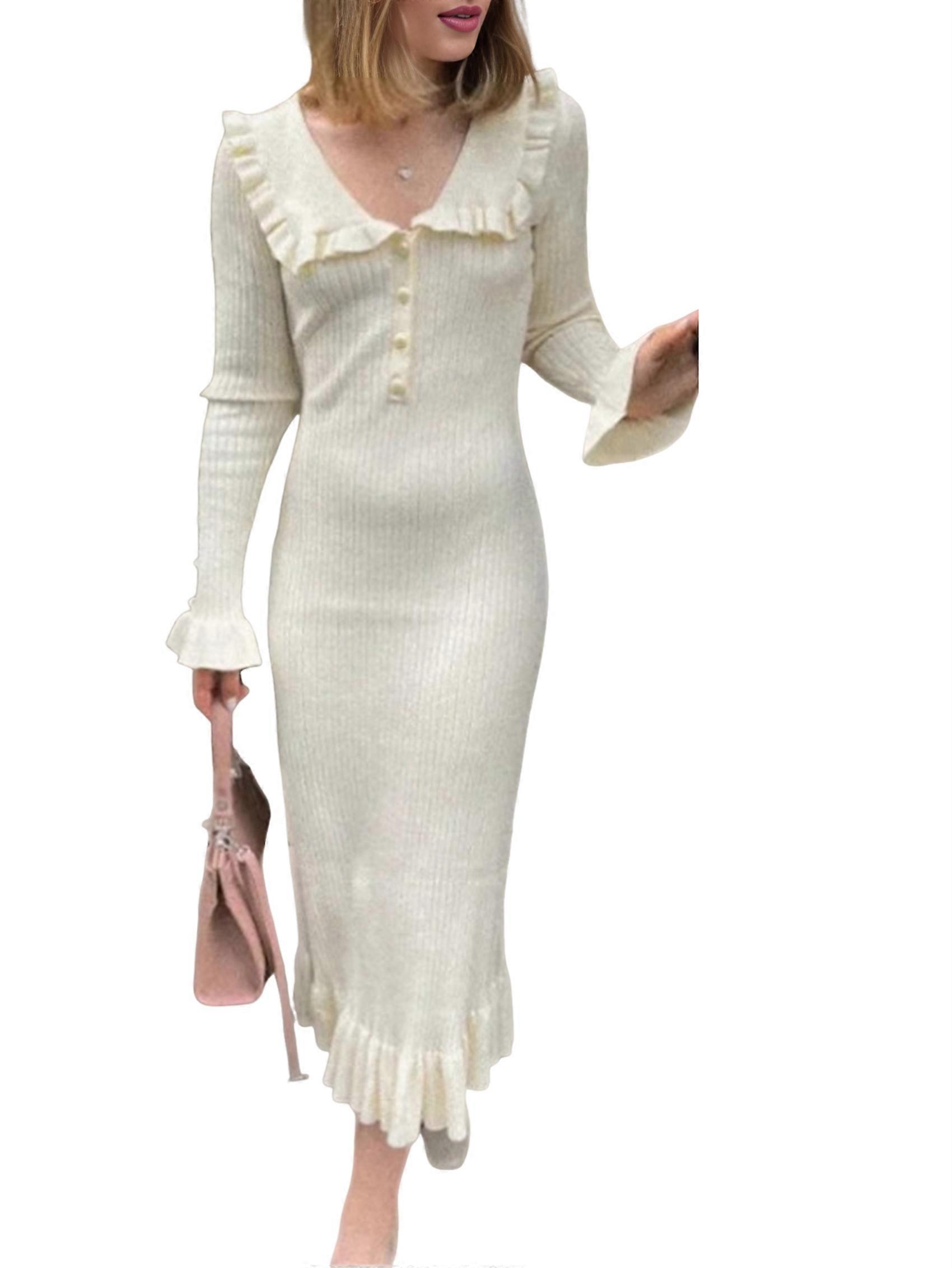 Women's ribbed knit sweater dress is made of soft and skin-friendly fabric, shows your flattering silhouette in this fall and winter. Ribbed knit, highly elasticity fabric, long sleeve, v neckline, foldover collar, button down front, solid color, contrast color at cuff and collar, slim fit, ankle length, comfy and cozy. This sweater dress will not only give you an incredible sense of touch, it will also hug your body in all the right places, outlining your fabulous silhouette and emphasizing your feminine curves. The contrast color trim add a delicacy feel to the simple design, rendering it even more chic. Pair it with your favorite necklace and heels for an effortlessly elegant look! Long sleeve sweater dresses are perfect for casual, evening, cocktail party, dinner, work, office, daily wear, streetwear, shopping, date night, going out, vacation, travel, and so on. Size: S=US4=UK8=EU36(cm / inch) Bust: 60.0 / 23.62, Length: 106.0 / 41.73, Waist: 50.0 / 19.69, Hip: 68.0 / 26.77 Colour: White Material: 100% Polyester Package Contents: 1 * Dress Only the above package content, other products are not included. Note: Light reflection and different displays may cause the color of the item in the picture a little different from the real thing. The measurement allowed error is +/- 1-3cm.