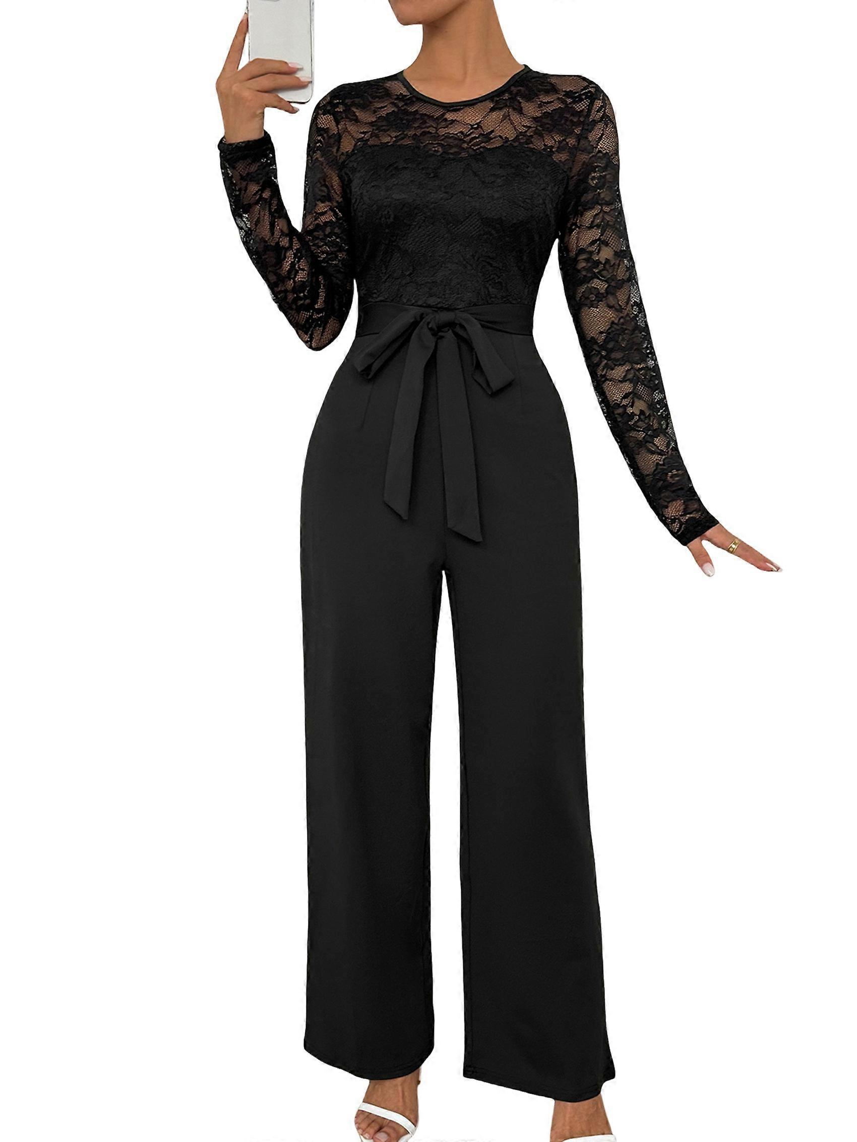 Women'S Lace Patchwork Round Neck Long Sleeve Formal Jumpsuit Solid Color Casual One-Piece Pants Black XL