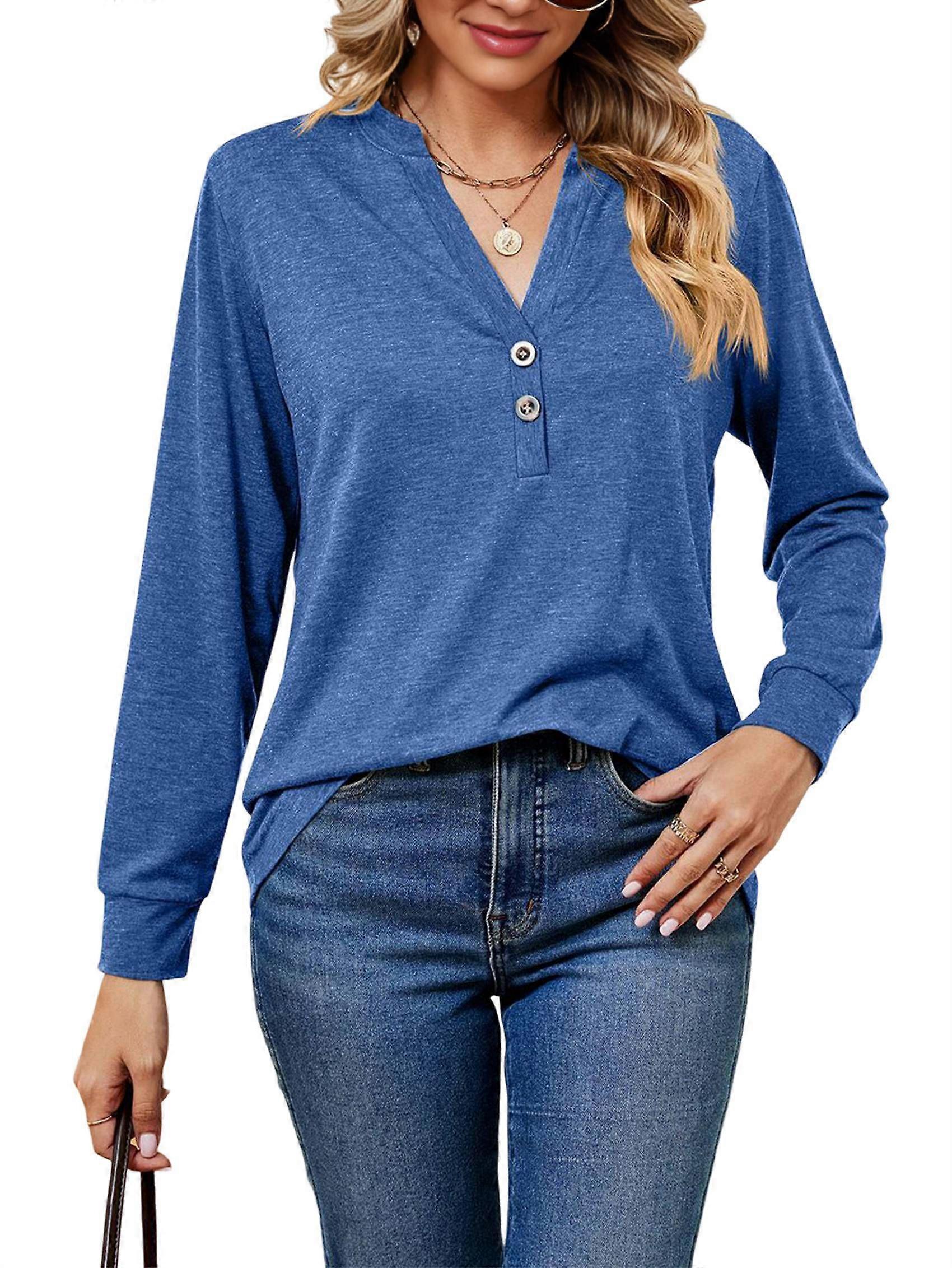 Women'S Long Sleeve Shirts 2025 Fall Henley Dressy Casual Trendy Blouses Cute T-Shirts Clothes Colorful Blue L
