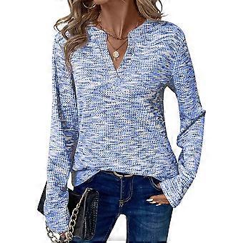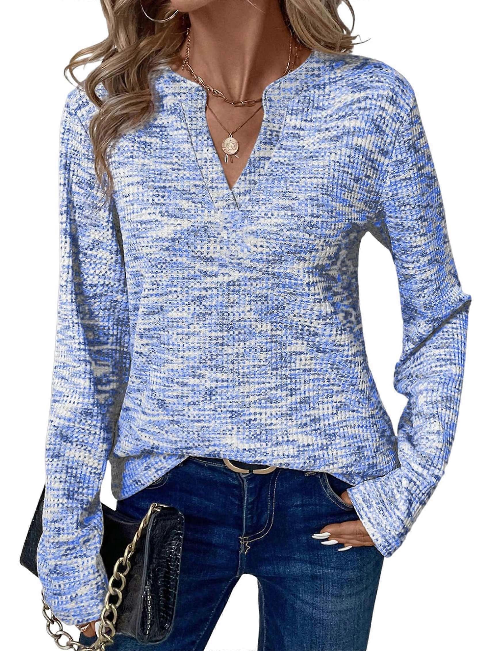 This long-sleeved shirt is made from 95% polyester and 5% spandex. The soft, vibrantly colored waffle knit fabric offers medium stretch and is comfortable and breathable, making it an ideal choice for spring, fall, and winter. Featuring a classic V-neck, long sleeves and a relaxed fit, this waffle-knit top exudes modern allure. Classic long sleeve design pairs well with a variety of pants and skirts; a must-have for autumn and winter wardrobes, it can be styled with jeans or dress pants for multiple looks. This womens tops are perfect for everyday styling, business, office, homewear, work from home, casual wear or parties, fall and winter, going away, Year's, back to school, Valentine's day,christmas,halloween,street styling and more. Size: L=US8=UK12=EU40(cm / inch) Bust: 107.0 / 42.13, Sleeve: 63.0 / 24.80, Length: 67.0 / 26.38 Colour: Sky Blue Material: 95% Polyester, 5% Spandex Package Contents: 1 * Womens Waffle Knit Tops Only the above package content, other products are not included. Note: Light reflection and different displays may cause the color of the item in the picture a little different from the real thing. The measurement allowed error is +/- 1-3cm.