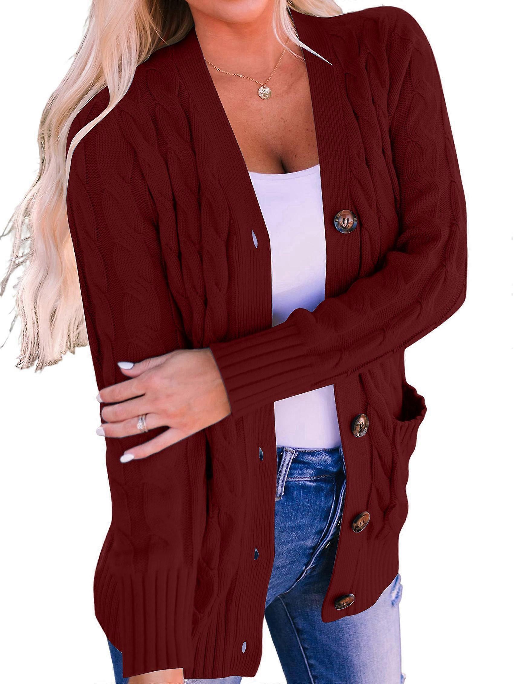 Women'S 2025 Fall Long Sleeve Cable Knit Sweater Open Front Cardigan Button Loose Outerwear Wine Red M