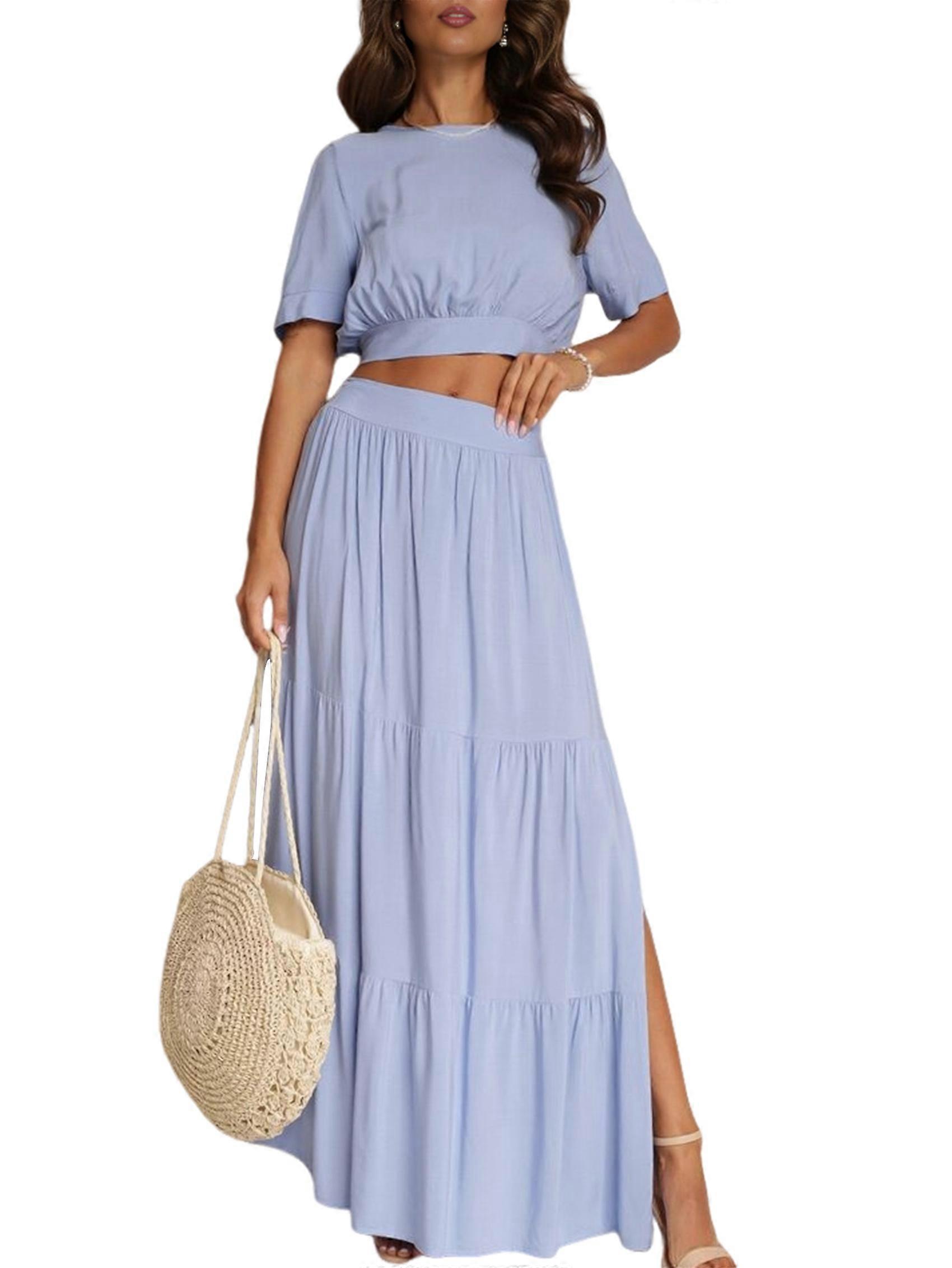 Women'S 2025 Summer Flowy Boho Maxi Skirt Trendy Slit Elastic High Waist A Line Beach Long Skirts Blue S