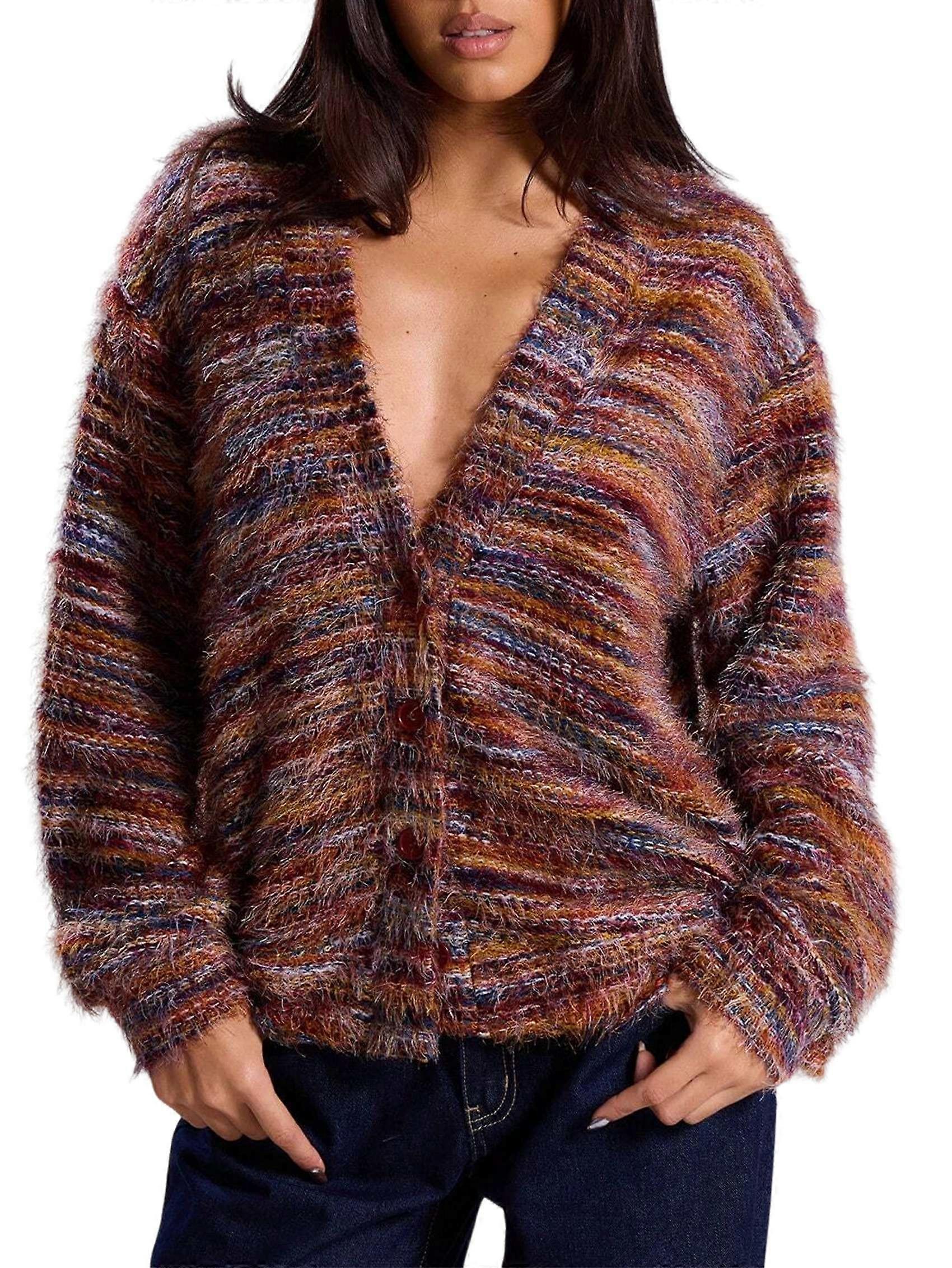 Women'S Oversized Striped Cardigan Sweaters Button Down Long Sleeve Drop Shoulder Knit Outerwear Coat Dark Red XL