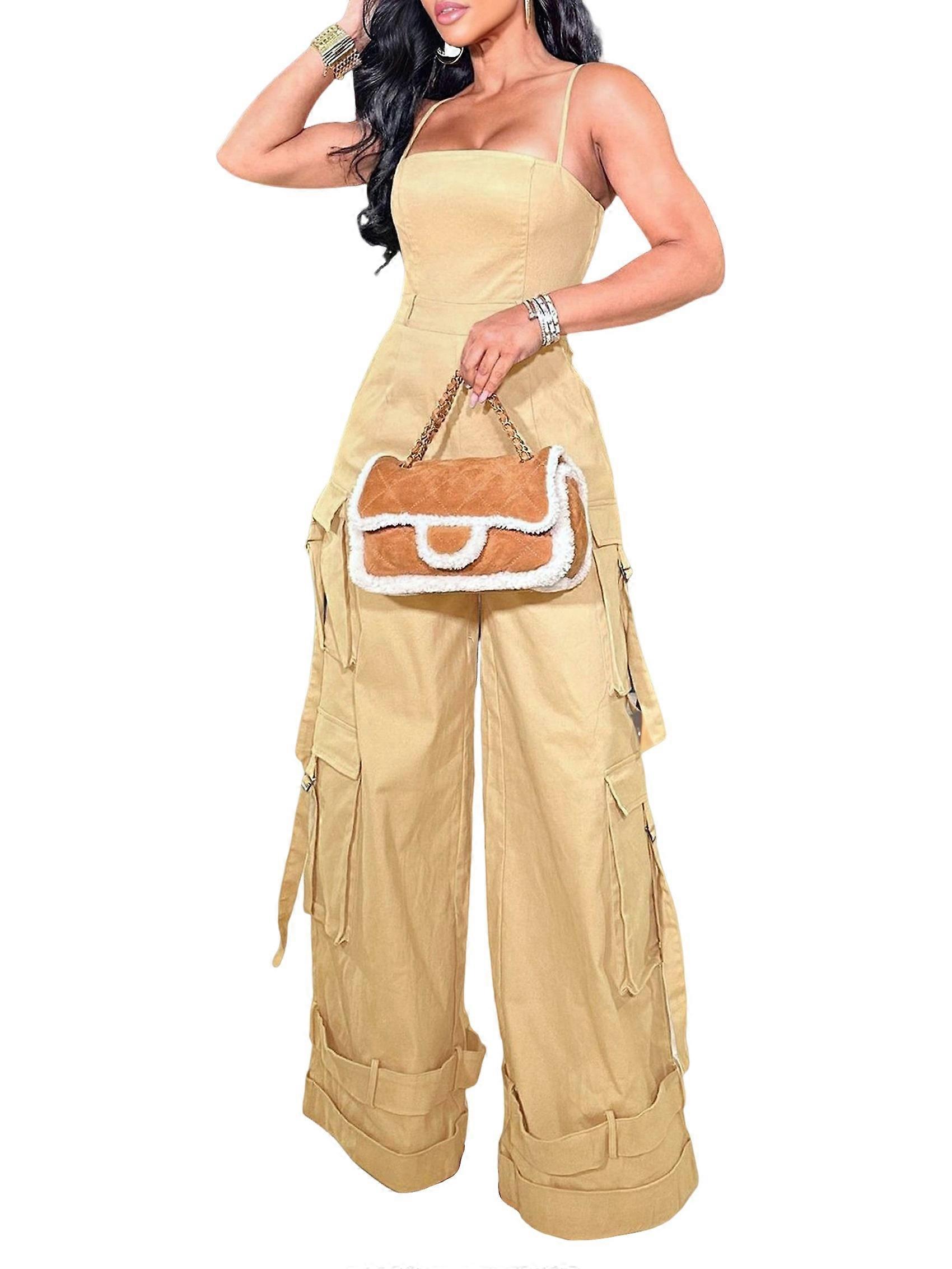 Women'S Overalls Jumpsuit Wide-Leg Jumpsuit Multi-Pocket Overalls Khaki L