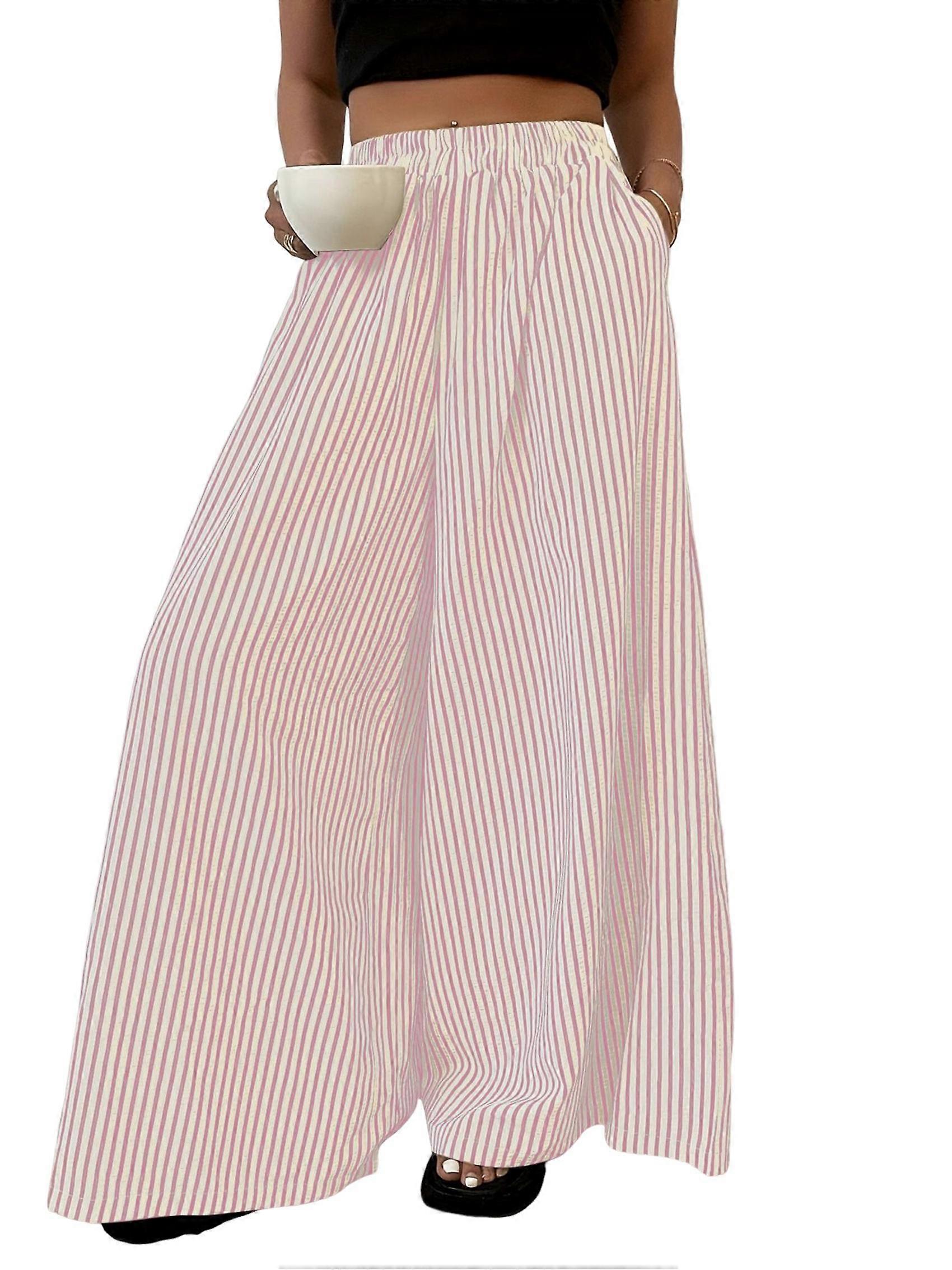 Women'S Striped Wide Leg Pants Elastic Waist Baggy Palazzo Trousers with Pockets Going Out Outfits Pink L