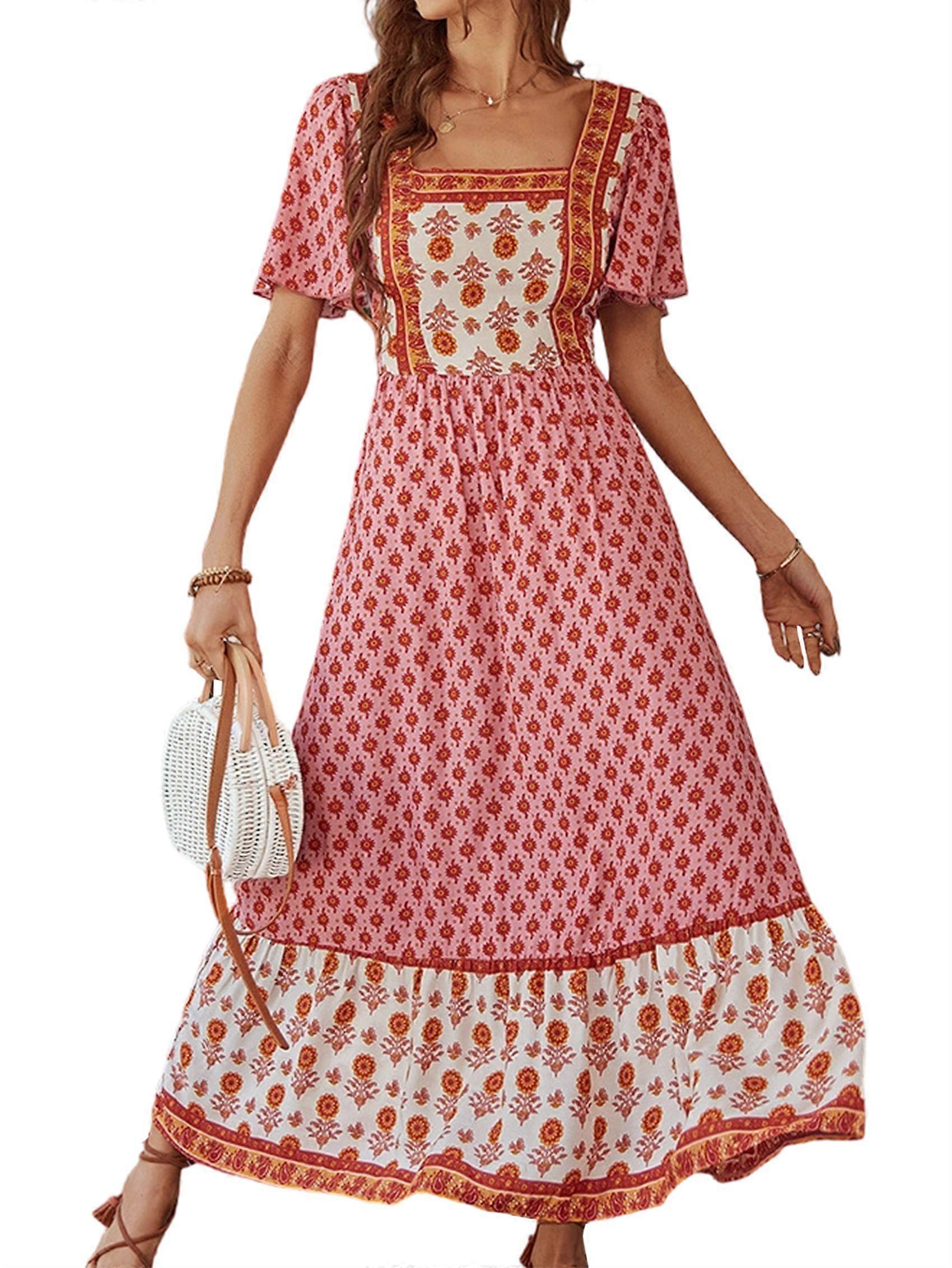 Short Sleeve Dresses for Women Spring Summer Flowy A-Line Boho Maxi Party Long Dress Pink M