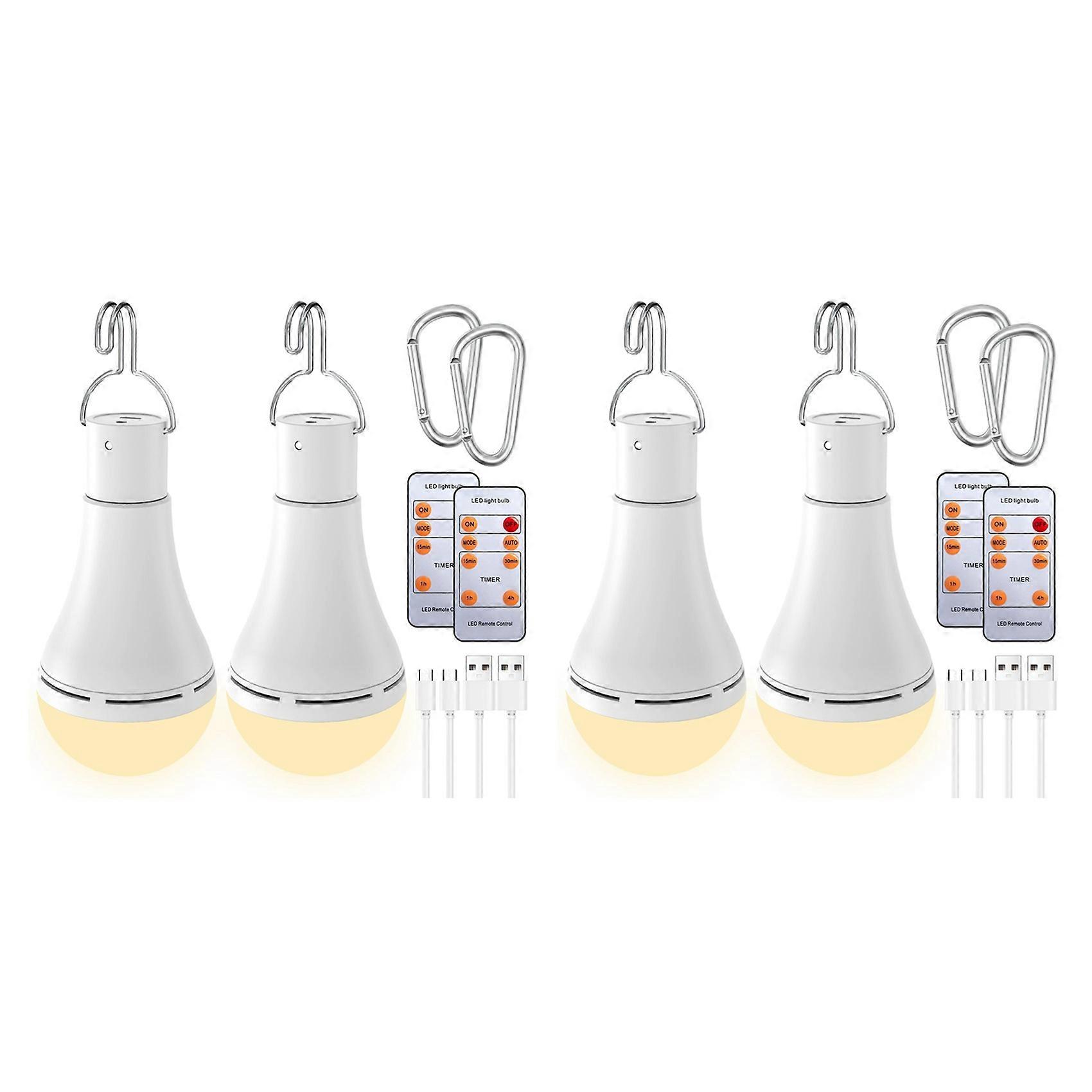 High-Brightness USB Rechargeable LED Light Bulbs: unique LED light bulbs come with a built-in upgraded high-capacity 2000mAh battery producing a warm white 900 lumens of brightness, equivalent to a 60-watt incandescent. Charging to full in 4-6 hours via micro-USB cable or a 5-volt adapter, these bulbs have a functional span of 6-9 hours. LED Light Bulbs with Remote Control Functionality: Enjoy quick and easy control with an included remote control. This allows you to turn the lights on and off, select from 4 lighting modes (High, Medium, Low, SOS) and set a timer (15, 30, 60, 240 min) from even across the room. Convenient especially when the bulbs are set up in hard-to-reach locations. Versatile Lighting Settings: With high, medium, low and SOS light modes along with a memory mode, these bulbs are designed to automatically turn on to your last used brightness level saving you the effort of repetitive adjustments, for use in various conditions. Practical Design for Multiple Uses: The bulbs' easy-to-carry handle, anti-slip finish makes them suitable not just as your standard light bulb but also as versatile flashlights for camping, fishing and hiking adventures, enhancing your outdoor experience. Wider Use with Included Carabiner Hook: Use the carabiner hooks to hang these emergency light bulbs in areas including, but not limited to, your pantry, closet, camping tent, camper, canopy, chicken coop, kitchen cupboard, wall sconce, lantern, outdoor bathroom, entryway, and even during travels. These bulbs are as handy as they are practical. Please note: There is a slight color difference or difference in kind, it does not affect the use, please do not mind, thank you! Colour: White Material: ABS+PC Package Contents: 4 x Rechargeable LED Light Bulb 4 x Remote Control 4 x Micro-USB Charging Cable 4 x Carabiner Hook Only the above package content, other products are not included. Note: Light reflection and different displays may cause the color of the item in the picture a