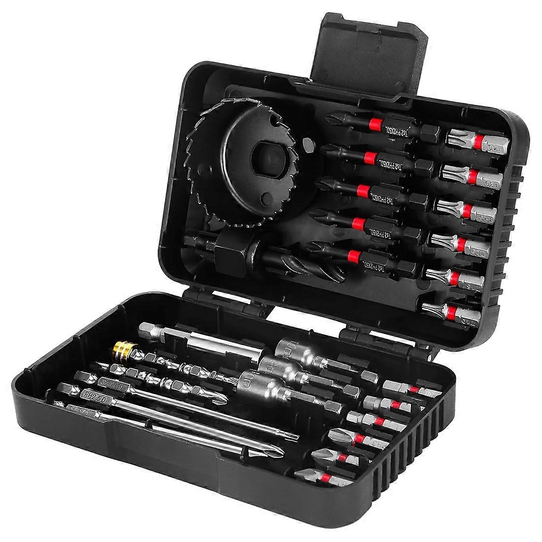 Sturdy and durable construction: This 27-piece magnetic nut driver and PH2 impact driver bit set is made from premium stainless steel and advanced impact-resistant materials. It delivers strong torque output without deformation, resists rust and corrosion, and maintains stable performance Versatile screwdriver bit kit: Includes multiple sizes of Phillips, slotted, hex and other common bit types to meet a wide range of fastening needs. Equipped with a magnetic drive guide that firmly holds bits in place, One compact set is enough for most household, DIY and light professional work. Wide application range: The driver bit set is compatible with most electric drills, impact drivers and manual screwdrivers. Ideal for driving screws and bolts into wood, metal, plastic and other materials, it can also be used for assembling and disassembling electronic devices, small household appliances, furniture and other everyday repair tasks. Easy storage and organization: All screwdriver and drill bits are neatly arranged in a sturdy plastic storage case, making it simple to identify and access the right size at a glance. The compact, durable case protects the bits from damage, is easy to carry in a toolbox or backpack, and keeps your work area tidy at home, in the garage or on the go. Safe and secure operation: The magnetic screw-lock sleeve provides a firm, reliable connection between bit and fastener, significantly reducing slipping, dropping and wobbling during use. This improves precision and control, making the set suitable for both experienced professionals and beginners who want safer,more efficient fastening and drilling Color: Black Material: Metal Package Contents: 1*Magnetic Nut Driver Set Only the above package content, other products are not included. Note: Light reflection and different displays may cause the color of the item in the picture a little different from the real thing. The measurement allowed error is +/- 1-3cm.