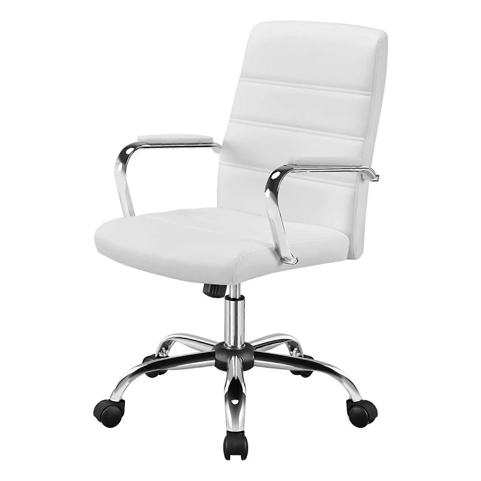 Color: Argento; Size: Light Grijs A modern office chair designed for comfort, mobility, and a clean contemporary look. This midback swivel chair combines 360degree rotation, smooth casters, and adjustable tilt and seat height so you can work, study, or meet in comfort while keeping your space stylish and easy to maintain. Key benefits Comfortable support for extended use: padded seat and back with resilient foam for daily office tasks or home study sessions. Full mobility and access: 360 degree swivel and smooth casters allow easy movement around a desk or between work zones. comfort: heightadjustable gas lift and tilt lock mechanism let you set seat height and recline to match your posture and task. Low maintenance: water resistant PU leather upholstery and chrome arms are easy to wipe clean. Contemporary aesthetic: Argento color with chrome accents provides a modern, professional look. Features and specifications Color: Argento; Size: Light Grijs Materials: PU leather, plywood, foam, chrome steel Seat back size: 48 x 59.5 cm / 19 x 23.4 inches Seat size: 48.5 x 46 cm / 19 x 18 inches Seat height: 46 56 cm / 18 22 inches Overall dimensions: 61.5 x 60 x cm / 24.2 x 23.6 x inches Maximum capacity: 130 kg / 287 lb Net weight: 13.9 kg / 30.5 lb Assembly: all parts and hardware included for easy assembly Practical use scenarios Home office: Use as a primary desk chair for computer work, virtual meetings, and daily tasks, with adjustable settings for comfort during long sessions. Shared workspace or meeting room: Mobility and swivel function make it easy to move between desks, collaborate, and join discussions without standing up. Study or creative studio: The adjustable tilt and height allow quick ergonomic adjustments for reading, sketching, or focused projects. Notes Manual measurements may have an error of 1 to 3 cm. Actual product color may vary slightly from images due to display and lighting differences. This chair offers a balance of comfort, mobility, and a clean design that adapts to common office and home working environments.