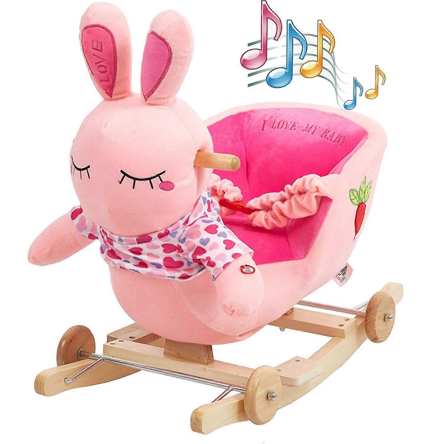 Baby Rocking Horse with Wheels and Music, Plush Wooden Rabbit Ride On Toy with Safety Seat Belt