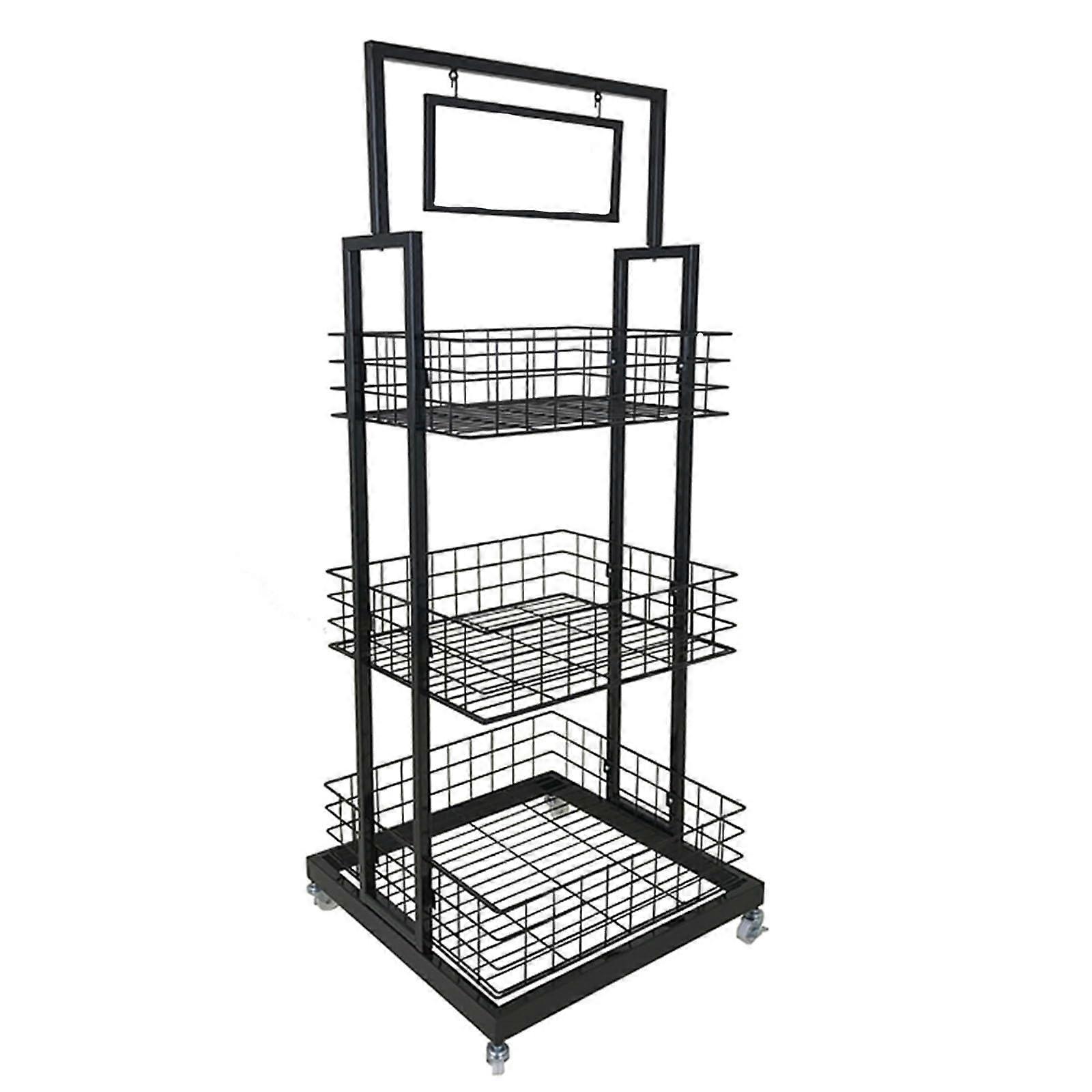 Black Snack Display Rack with Wheels, Rolling Metal Storage Cart with Hooks and Basket for Pantry