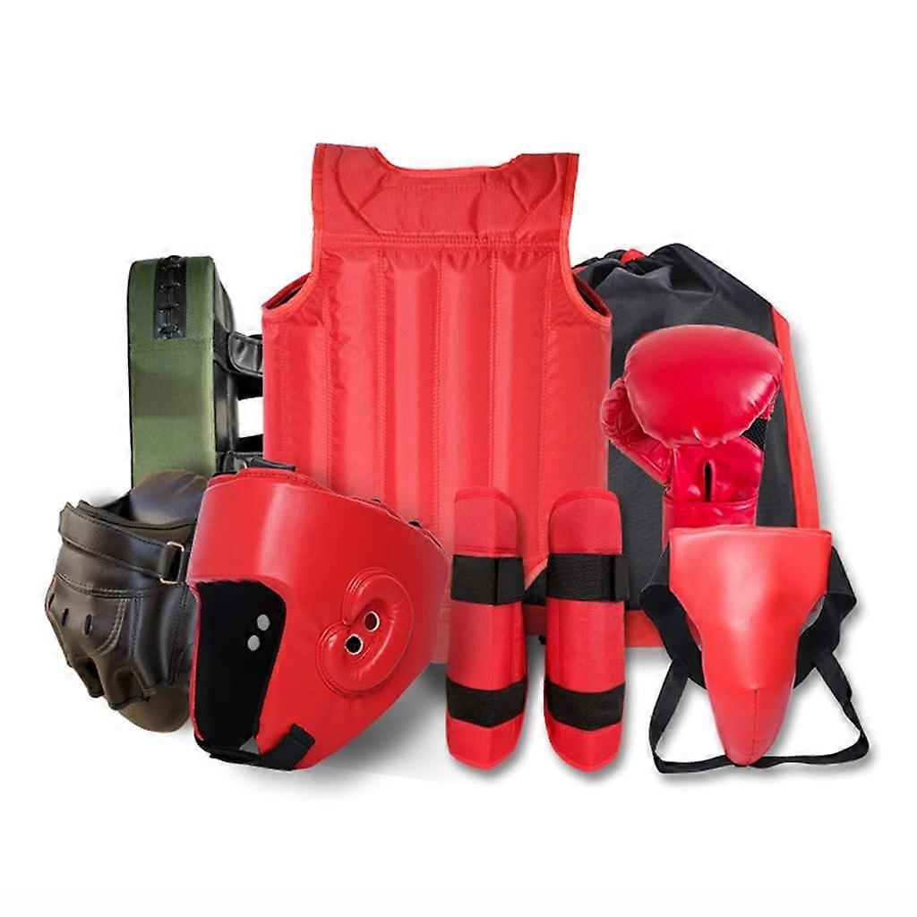 Size: Red Product overview This full body protective set is designed for athletes and sparring practitioners who need comprehensive coverage during training and competition. The set combines durable outer materials with layered foam and molded shells to balance impact protection, comfort, and breathability. Key components and materials Head gear: Thickened PU leather outer, foam liner, and a hollowed out design for ventilation to reduce heat buildup. Includes a silicone mouthguard that is odorless. Breast guard: Oxford fabric stitching with a foam liner and a thickened bamboo board insert for durable protection of the chest, abdomen, and ribs. Crotch guard: Thickened PU leather with a PP molded protective shell for strong impact resistance while maintaining wearer comfort. Instep protector: Finely woven cotton construction for a comfortable, secure fit over the foot. Leg guard: Mesh Oxford fabric with reinforced stitching. The surface is wear resistant and resists scratching. Boxing gloves: Thickened PU leather exterior with a polyurethane foam inner lining to improve shock absorption and responsiveness. Why choose this set Complete coverage: Designed to protect head, teeth, chest, abdomen, ribs, groin, instep, and legs in one coordinated set. Durable construction: Heavyduty PU leather, Oxford fabric, bamboo board inserts, and PP shells enhance longevity under regular training use. Comfort and breathability: Foam liners, breathable head gear design, and woven cotton instep keep the wearer more comfortable during extended sessions. Stable protection: Molded inserts and layered foam reduce transmitted impact while maintaining mobility. Function, fit, and compatibility Intended for athletes, martial artists, boxers, and sparring partners requiring full body protective gear. Color and identification: Size: Red for easy team or kit matching. Materials detailed above provide a balance between coverage and flexibility suitable for a wide range of contact sports and training formats. Typical use scenarios Sparring sessions at the gym where full protection of head, torso, groin, and legs is required to train safely with partners. Competitive amateur match warmups and practice drills that need reliable, durable protection without limiting movement. Group classes such as boxing, kickboxing, or mixed martial arts where repeated impact and frequent use demand durable equipment. Care and maintenance Wipe PU leather and Oxford fabric surfaces with a damp cloth after use and allow to air dry. Remove and rinse the silicone mouthguard regularly to maintain hygiene. Store the set in a dry, ventilated area to prolong material life. This set provides coordinated, durable protection and breathable comfort for athletes requiring full body coverage during training and sparring.