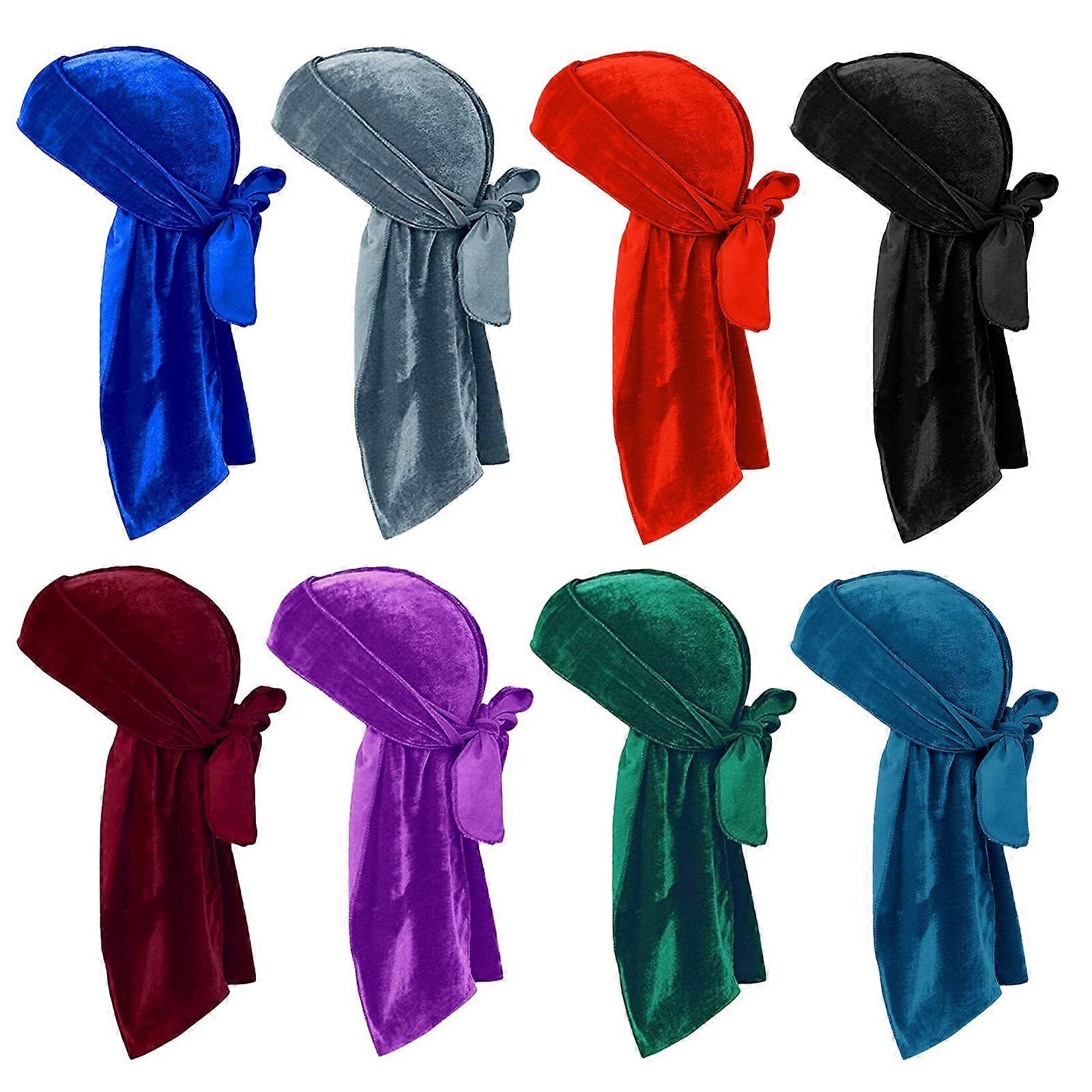 8 Pack Velvet Durag for Men and Women with Stocking Caps, Long Tail Headwrap for 360 Waves
