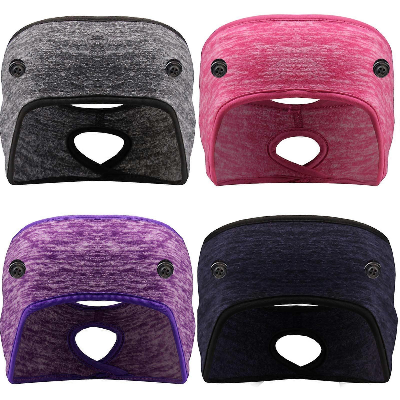 Ponytail Headbands with Buttoned Face Cover Support 4 Pack Ready for cold weather and active days, these polyester fleece headbands combine ear coverage, a secure ponytail opening, and a two button design that keeps face cover straps off your ears for greater comfort. Key benefits Reduces ear strain when wearing a face cover by routing straps around the built in buttons instead of the ears. Keeps ears and forehead covered and warm with a contoured fleece design that remains comfortable during movement. Secures ponytails through a dedicated opening to prevent slipping, avoid hair pulling, and keep hair in place. Versatile for different hair lengths and for use by women and men during indoor or outdoor activities. Features and specifications Material: polyester fleece for soft warmth and quick on and off. Size: 25 x 9.5 cm 9.8 x 3.7 inch; one size fits most. Colors included: black, pink, purple, navy blue. Quantity: 4 pieces. Package includes 4 ponytail headbands. Two button design for attaching face cover straps around buttons rather than ears. Contoured shape that covers ears and forehead without excess bulk. Ponytail hole positioned to hold hair securely without scratching or pulling. How it solves common problems Eliminates ear discomfort from prolonged face cover strap wear by providing secure button anchors. Prevents ponytail slippage and hair tangling while keeping head warm. Stays in place during activity thanks to the contoured fit and fleece material. Practical use scenarios Cold weather runs and jogging: keep ears covered and hair secured while running without strap irritation. Winter outdoor sports: use while skiing, ice skating, or hiking to retain warmth and keep hair out of the way. Daily errands or commuting: wear under a hood or jacket to reduce ear pressure from face covers and maintain comfort. What you get Four polyester fleece ponytail headbands in black, pink, purple, and navy blue, each 25 x 9.5 cm 9.8 x 3.7 inch, featuring two buttons and a ponytail opening for practical, comfortable wear.