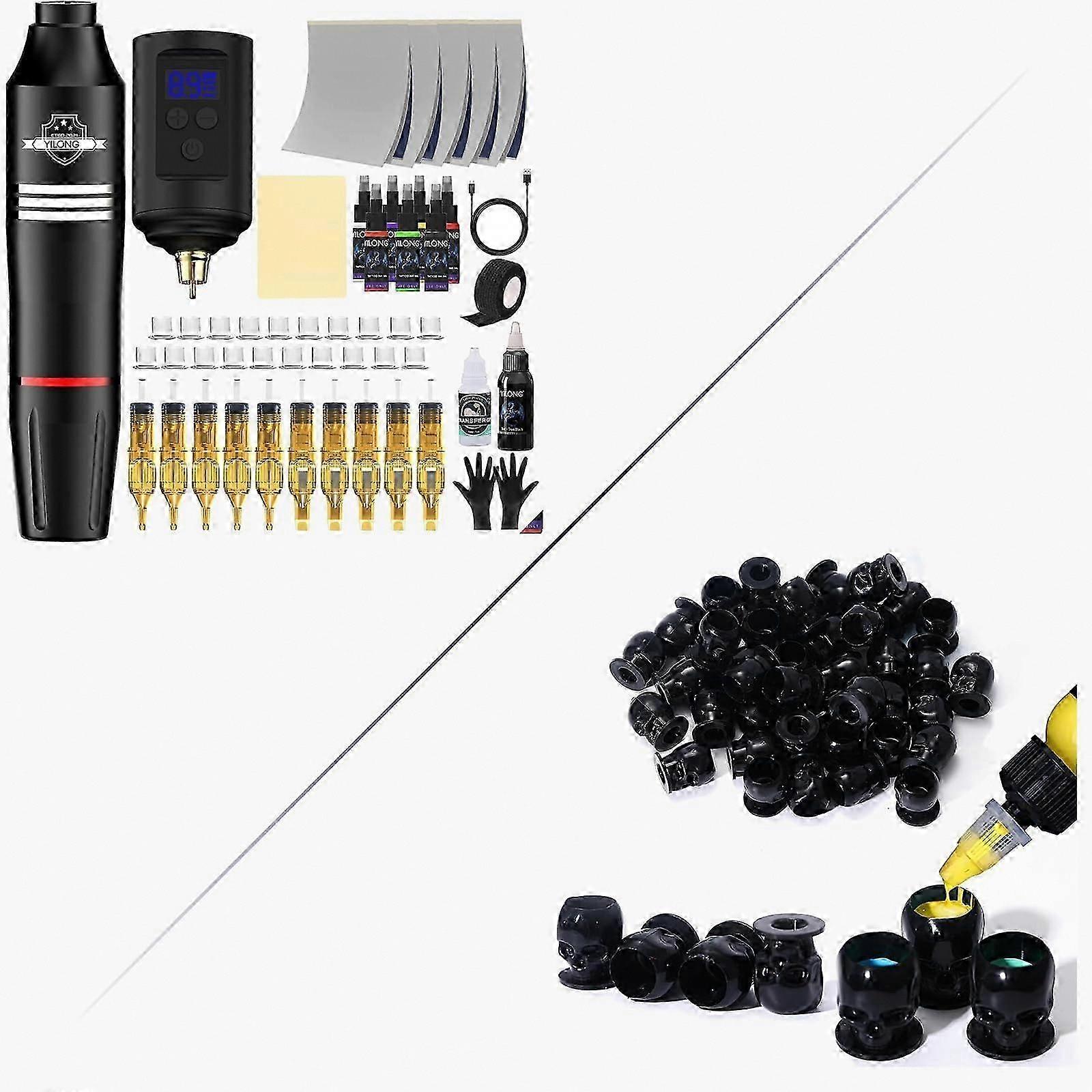 Portable wireless tattoo pen kit designed for stable, lowvibration performance and long runtimeKey benefitsConsistent power and smooth operation: 10,000 RPM motor delivers stable performance with low vibration and minimal noise for more comfortable, controlled work.Reliable power range: Output voltage 512V adapts to a variety of tattooing speeds and techniques.True wireless convenience: Includes a 1200mAh rechargeable battery that charges in 24 hours and runs 26 hours continuously, so no cables are required during use. Simply insert the power source and begin working.Complete starter set: Supplies and accessories included let you start tattooing or practicing right away, reducing setup time.Performance and functionMotor: speed 10,000 RPM for steady needle movement and consistent ink delivery.Voltage: 512V output for adjustable performance across shading, lining, and color work.Battery: 1200mAh wireless battery for portable operation. Charge time 24 hours; continuous runtime 26 hours depending on use.Noise and vibration: Engineered for low vibration and minimal noise to improve comfort during longer sessions.What is includedTattoo pen with integrated wireless batteryPower supply and charging cable20 ink cups30 mL tattoo black ink7 color tattoo inks1 pair of disposable tattoo gloves10 tattoo cartridge needlesTattoo grip coverTransfer gelPractice skin5 sheets of tattoo transfer paperAdditional packaging detailSkull tattoo color caps: pack of 200 pieces. Dimensions: head 14 mm, base 18 mm, height 20 mm. The skull color cup features a stable base that can sit directly on a desktop without an ink cup holder, helping streamline workflow.Materials and compatibilityIncludes disposable cartridge needles and consumables for immediate use. The pen is designed to work with the included cartridge needles and standard tattooing techniques.Practical use scenariosStudio sessions: Use the pen for lining and shading during client appointments where a quiet, lowvibration tool improves precision and comfort.Mobile or event tattooing: The wireless battery and compact form make the kit suitable for mobile artists working at conventions or private bookings.Training and practice: Practice skin, transfer paper, and included inks provide a ready setup for apprentices learning needle control and designs.Why choose this kitReadytouse configuration with a balanced mix of consumables and equipment.Portable, rechargeable operation lets artists work without cable restrictions.Clear specifications on motor speed, voltage range, and battery runtime help match the tool to common tattooing needs.No brand names or certifications are included. All specifications are provided as part of the product information.