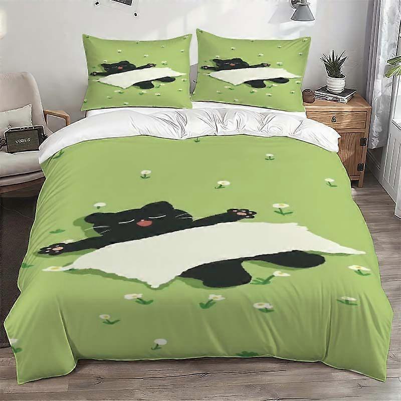 Black Kitten And Meadow Sleeping Bedding Set with a Cozy Illustration Theme. Includes a Duvet Cover And Two Pillowcases