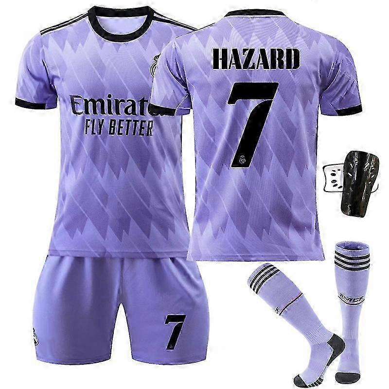 Football Uniform Set Design Number 7 Purple Modern Team Style Jersey Shorts Socks and Protective Gear Set