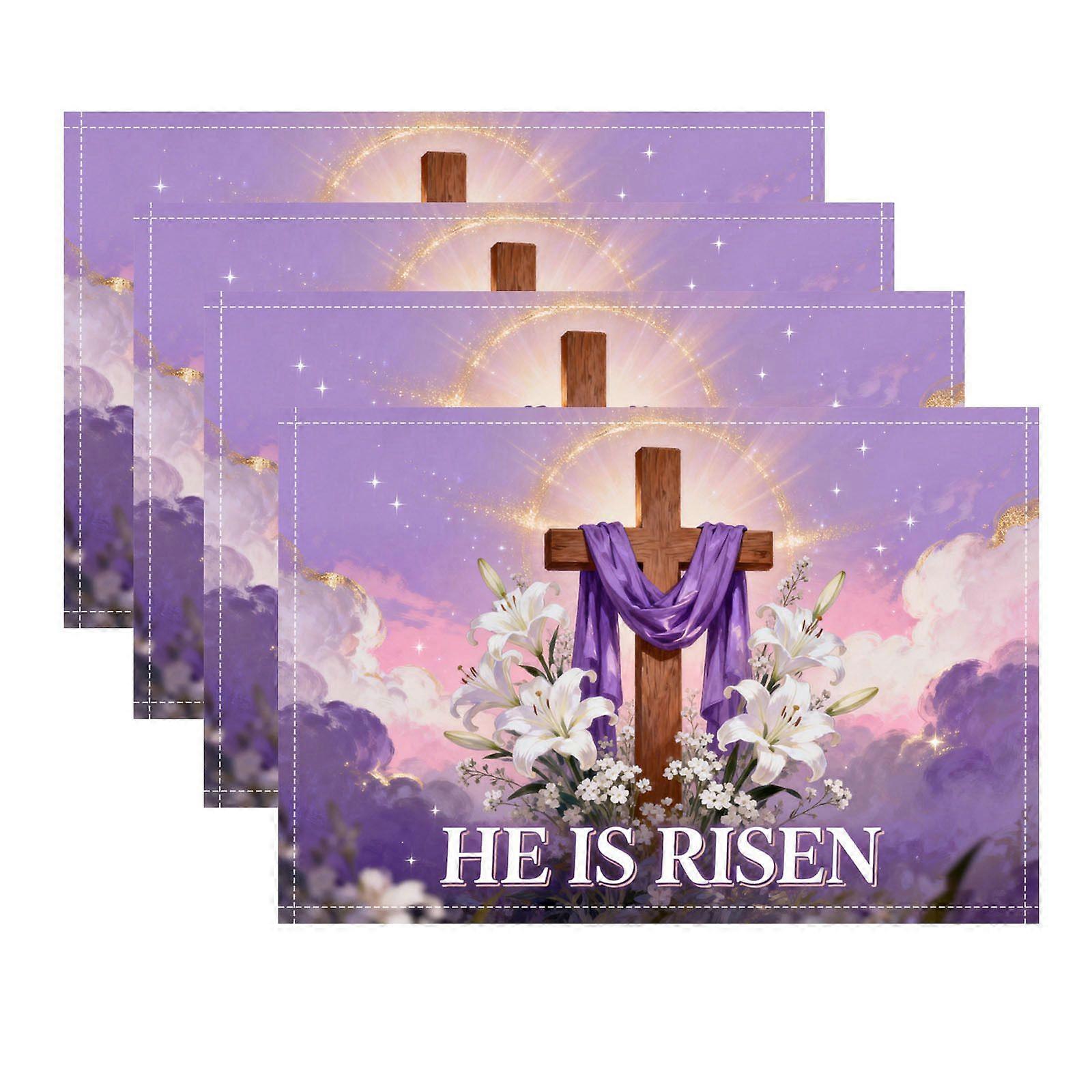 He is Risen Placemats, Easter Cross Lamb Linen Washable Place Mat, Spring Lily Flowers Heat Resistant Table Mats for Kitchen Dining Holiday Party Deco