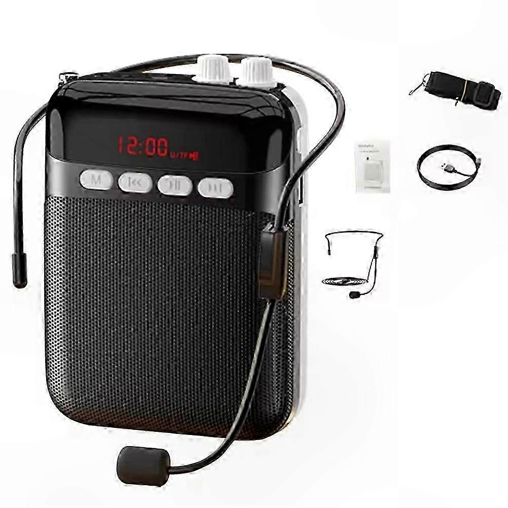 Product Features: - Portable Design: Lightweight and compact for easy carrying. Amplifies voice at high volumes while protecting vocal cords. Delivers clear audio output. - Long Battery Life: Built-in 1200mAh rechargeable battery supports up to 12 hours of continuous use. - Clear Sound Projection: Stable performance with flexible gooseneck microphone for optimal mouth-level placement. Supports music playback. - Versatile Use: Ideal for indoor and outdoor applications including retail announcements, public speaking, fitness instruction, and more. - Charging Input: 5V–2A - Battery: 3.7V, 1200mAh - Frequency Response: 150Hz–20kHz - Signal-to-Noise Ratio: >75dB - Effective Range: 15 meters - Audio Format Support: MP3 - TF Card Support: Up to 32GB (card not included) - Color: Black - Material: Plastic - Package Includes: 1 × Bluetooth speaker 1 × Wired microphone 1 × Belt strap 1 × Charging cable 1 × English user manual