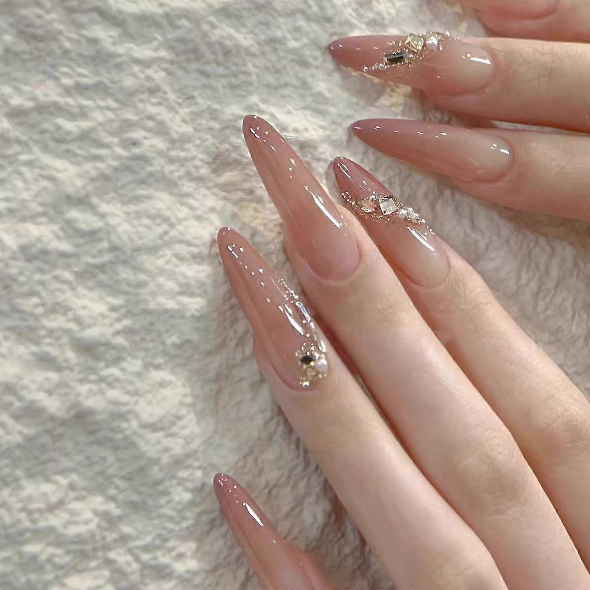 Luxury Handmade Press On Nails, French Style Glitter Heart Pearl Cat Eye Medium Oval Fake Nails Set for Women