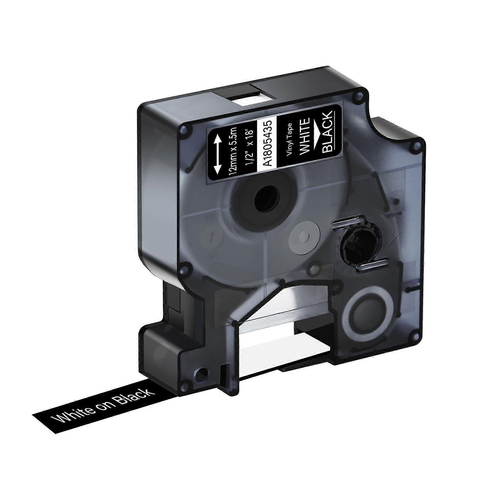 Package includes: 1 pack compatible with Dymo Rhino 1805435 vinyl permanent label tape Color: white print on black tape Size: 1/2 inch (12 mm) x 18 feet (5.5 m) Key benefits Clear, professional labels: White text on black vinyl provides contrast for easy reading in bright or low light. Reliable durability: Vinyl tape resists water, fading, abrasion, chemicals, grease, and exposure to sunlight, and withstands wide temperature ranges for indoor and outdoor use. Cleaner printing results: Bottom cut line design prevents center lines and misprints for sharper, more consistent output. Strong, removable adhesion: Industrial strength adhesive sticks to most clean, dry, flat surfaces and stays durable in harsh conditions while leaving no sticky residue after removal. Features Material: Permanent vinyl label tape designed for longterm identification and organization. Print color: White print on black background for maximum legibility. Size: 1/2 inch (12 mm) width, 18 feet (5.5 m) length per roll. Compatibility: Designed to work with Rhino 1805435 label systems. Performance: Waterresistant, faderesistant, abrasionresistant, chemicalresistant, greaseresistant, and resistant to temperature extremes and sunlight without peeling. Practical applications Office filing and asset identification: Create durable labels for folders, file boxes, shelves, and equipment to keep records and assets organized. Home appliance and kitchen labeling: Label refrigerators, microwaves, dishwashers, storage containers, and pantry shelves with labels that resist moisture and grease. Industrial and facility use: Mark cables, pipes, storage racks, electrical panels, and laboratory equipment with labels that remain readable in warehouses, labs, and maintenance environments. Why choose this tape This vinyl permanent label tape combines durable material, strong adhesion, and a printfriendly cut line to reduce misprints and ensure longlasting, legible labels across a wide range of settings. The roll size and standard 1/2 inch width make it suitable for common label jobs while fitting compatible Rhino 1805435 label systems.