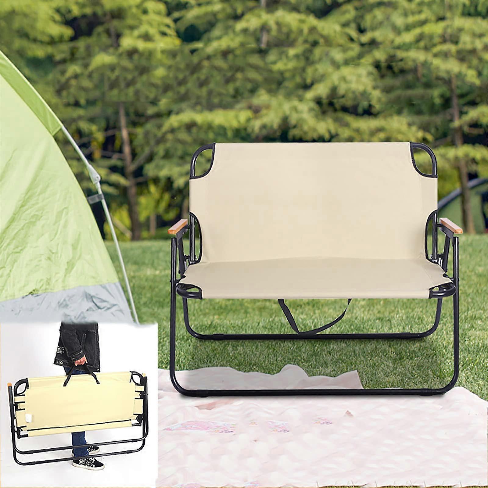 Portable 2Seater Folding Camping Bench with Backrest, Lightweight Durable Beige Outdoor Chair for Hiking and Fishing