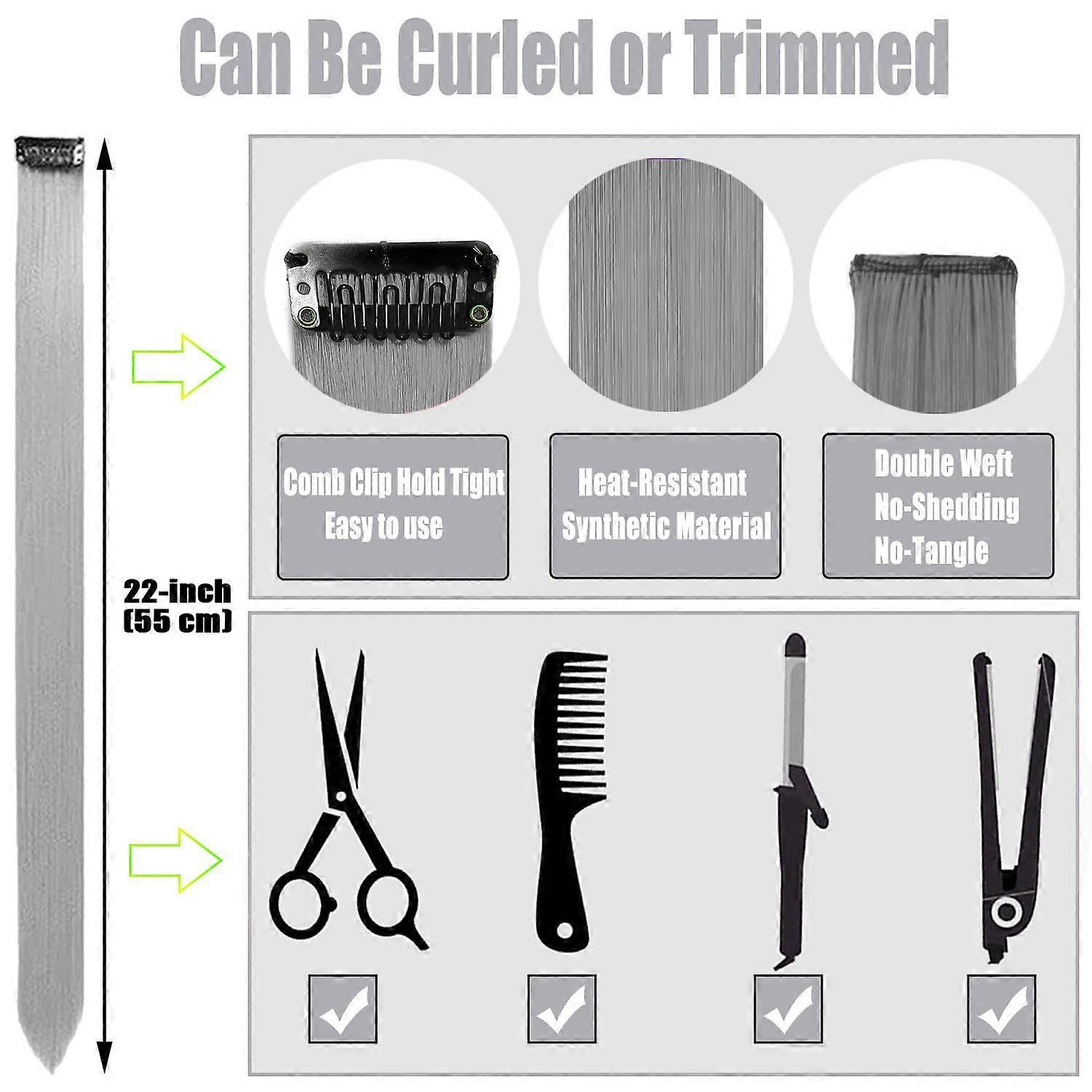 2-Pack Grey Clip-In Hair Extensions | 22 Inch Long Straight Synthetic Highlights | Silky Smooth Tangle-Free Hairpieces for Women, Parties & Cosplay