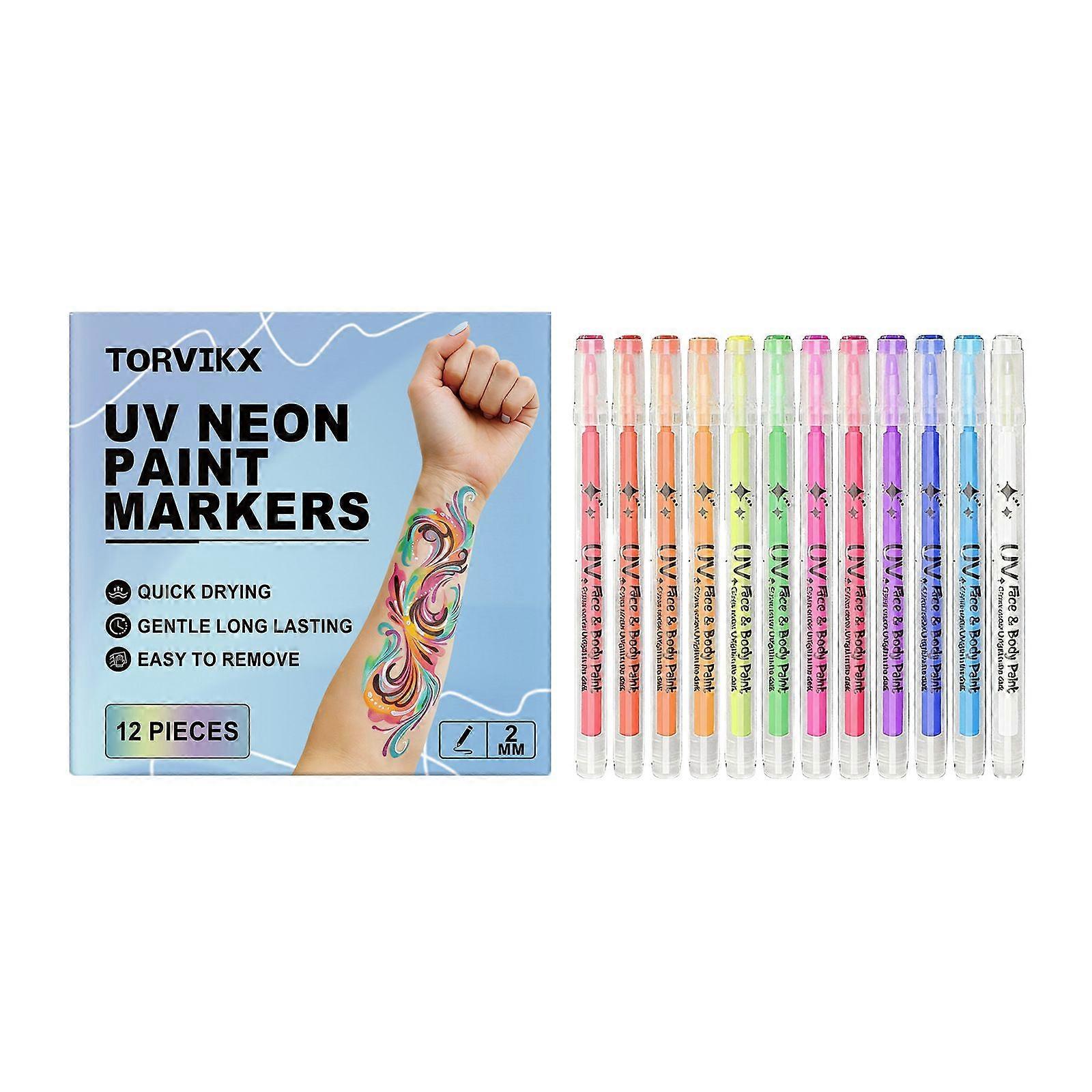 12-Pack UV Neon Temporary Tattoo Markers | Skin-Safe Body Art Pens for Kids & Adults | Glow-in-the-Dark Under Blacklight, Quick-Drying & Easy to Remov