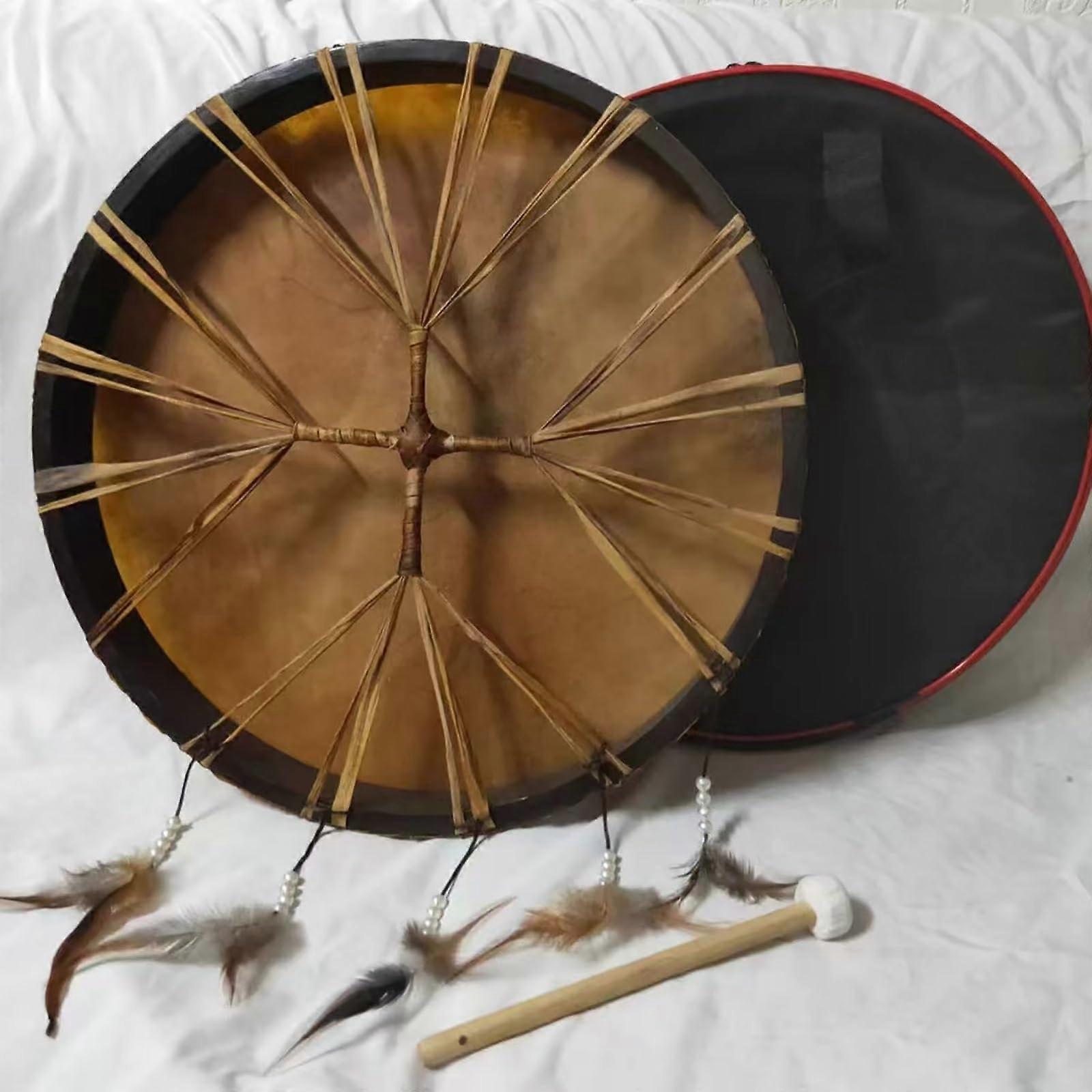Product overview Handcrafted shaman drum in Cross color, available in 16, 18, and 20 inch diameters (40 cm corresponds to the 16 inch size). Constructed with natural hide, sinew rope, and a wooden frame for an authentic acoustic response and reliable durability. Key benefits Authentic materials and construction: Natural hide head, sinew rope lacing, and a solid wooden frame deliver warm, resonant tones and longlasting structure. Ready to use and easy to carry: The back is tied with durable sinew to form a secure handle. A mallet and protective bag are included for transport and storage. Simple to play, quick to learn: Hold the drum by the handle and strike the center with the included baton to produce a clear, steady pulse. Different striking positions create a range of tones. Versatile across settings: Suitable for drum circles, stage performances, cultural ceremonies, classroom music instruction, and community gatherings. Unique, handcrafted finish: Each drum is individually made, so surface texture, color variation, and sound character are unique to the instrument. Features and specifications Sizes: 16 inch (40 cm), 18 inch, 20 inch. Color: Cross. Materials: Natural hide (goat or sheepskin reported), sinew rope lacing, wooden frame. Handle: Tiedback rope handle for secure grip. Package includes: 1 shaman drum, 1 drumstick, 1 drum bag. How it performs The finely textured drum head produces a comfortable, rounded sound with good projection and a strong bass presence when struck in the center. The construction supports consistent tone across indoor and outdoor use, and the handle design makes handheld playing simple during movement or standing performances. Typical use scenarios Drum circles and festivals: Provide steady rhythm and a deep foundational pulse for group playing. Classroom and workshops: Teach basic rhythm, coordination, and group musicmaking with an instrument that is easy for learners to handle. Ceremonial or cultural performances: Complements traditional clothing and other hand drums in formal or informal cultural settings. Who will find it useful Musicians, performers, teachers, students, cultural enthusiasts, and folk music practitioners who want a portable, handcrafted frame drum with an authentic sound and traditional construction. Care and handling tips Store in the provided bag to protect the head from dust and impact. Avoid prolonged exposure to extreme heat or moisture to preserve the natural hide and wooden frame. Tune or retension by checking sinew lacing and adjusting as needed; consult a drumcare guide for detailed maintenance steps. This shaman drum offers straightforward playability, authentic materials, and a distinctive handcrafted character suitable for a wide range of musical and cultural applications.