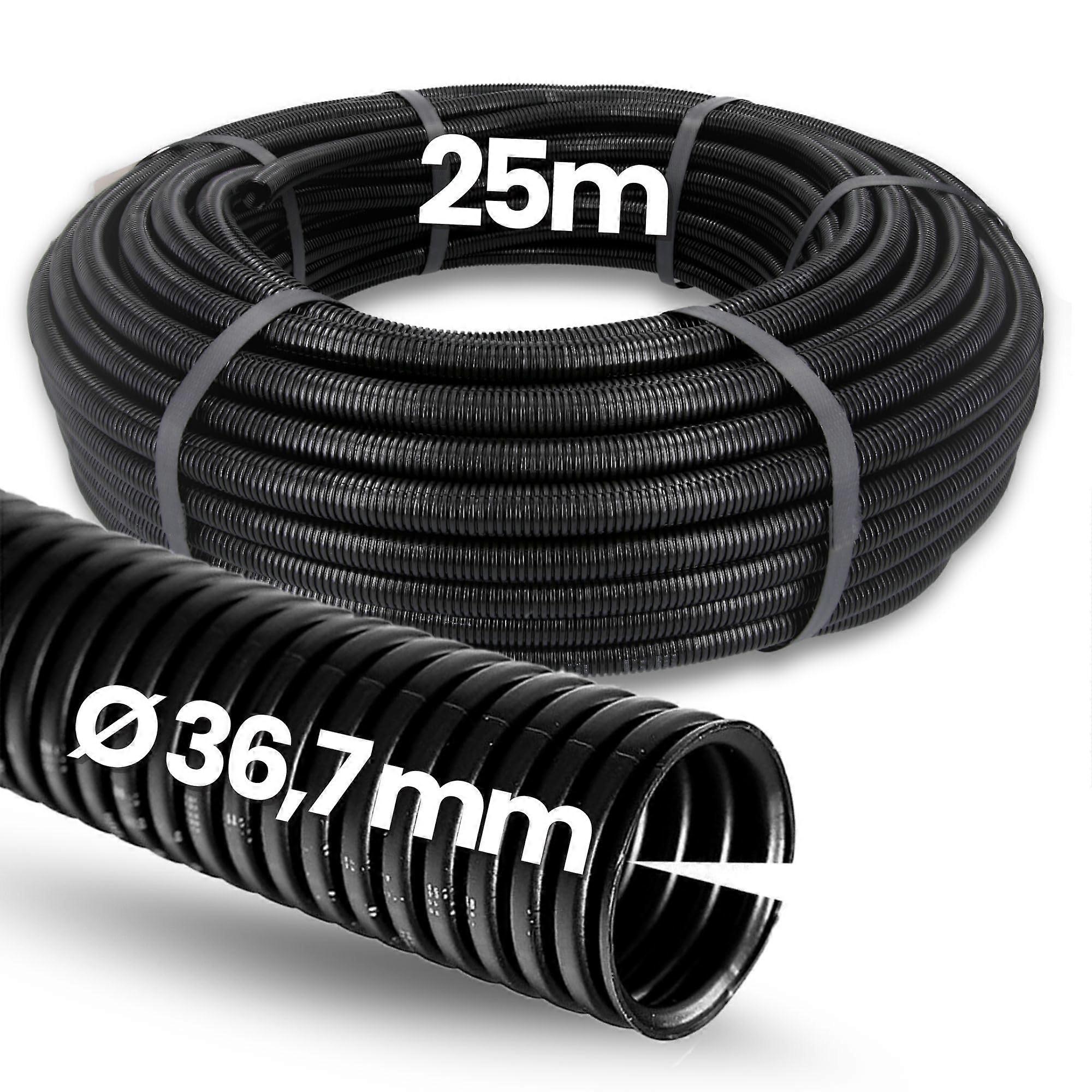 Corrugated slotted protection hose NW 37 for cable routing and rodent protection Length 25 m | Outer diameter AD 42 mm | Inner diameter ID 36.7 mm What this product does Flexible corrugated tube with longitudinal slot for quick, tool insertion of cables. Designed as an empty protection pipe for electrical, telecom, and control cables where a continuous, accessible conduit is needed. Nominal width NW 37 and precise dimensions allow predictable fit with junctions, connectors, and standard installation accessories. Key benefits Easy installation: the slotted, open design lets you add or remove cables without disconnecting runs or cutting the tube. Spaceefficient protection: AD 42 mm outer diameter and ID 36.7 mm inner diameter provide ample space for cable bundles while keeping the profile compact. Long continuous length: 25 m roll minimizes joints and reduces installation time on long runs. Robust corrugated construction: maintains flexibility for routing around bends while providing structural support along the run. Compatible with common conduit fittings sized for NW 37 and 42 mm outer diameter, helping integrate with existing systems. Features and specifications Product type: corrugated slotted protection pipe, open hose, empty tube Nominal width: NW 37 Outer diameter: AD 42 mm Inner diameter: ID 36.7 mm Length: 25 m Use: cable protection and guided routing in building installations, industrial equipment, and outdoor runs Practical use scenarios 1) Building renovation: Run data and power cables along ceilings and walls without tearing open finishes. The slotted tube lets you feed additional cables later without opening installed runs. 2) Outdoor lighting and garden installations: Create a continuous conduit for lighting and lowvoltage control cables where a weatherproof trench or surface run is required. The corrugated design eases routing around obstacles. 3) Machinery and vehicle wiring looms: Provide a flexible protective channel for control cables in workshops or service vehicles where frequent access or cable changes are expected. Installation tips Use compatible clamps, grommets, and end caps designed for AD 42 mm or NW 37 to secure the run and seal entry points. For multiple bends, support the tube at regular intervals to avoid sagging and to maintain cable pathway integrity. For retrofit work, open the slot, position the cable, then snap the tube into place and secure with ties or clamps as needed. This corrugated slotted hose provides a practical, readytoinstall solution for organized, accessible cable protection and routing in a wide range of installation environments.