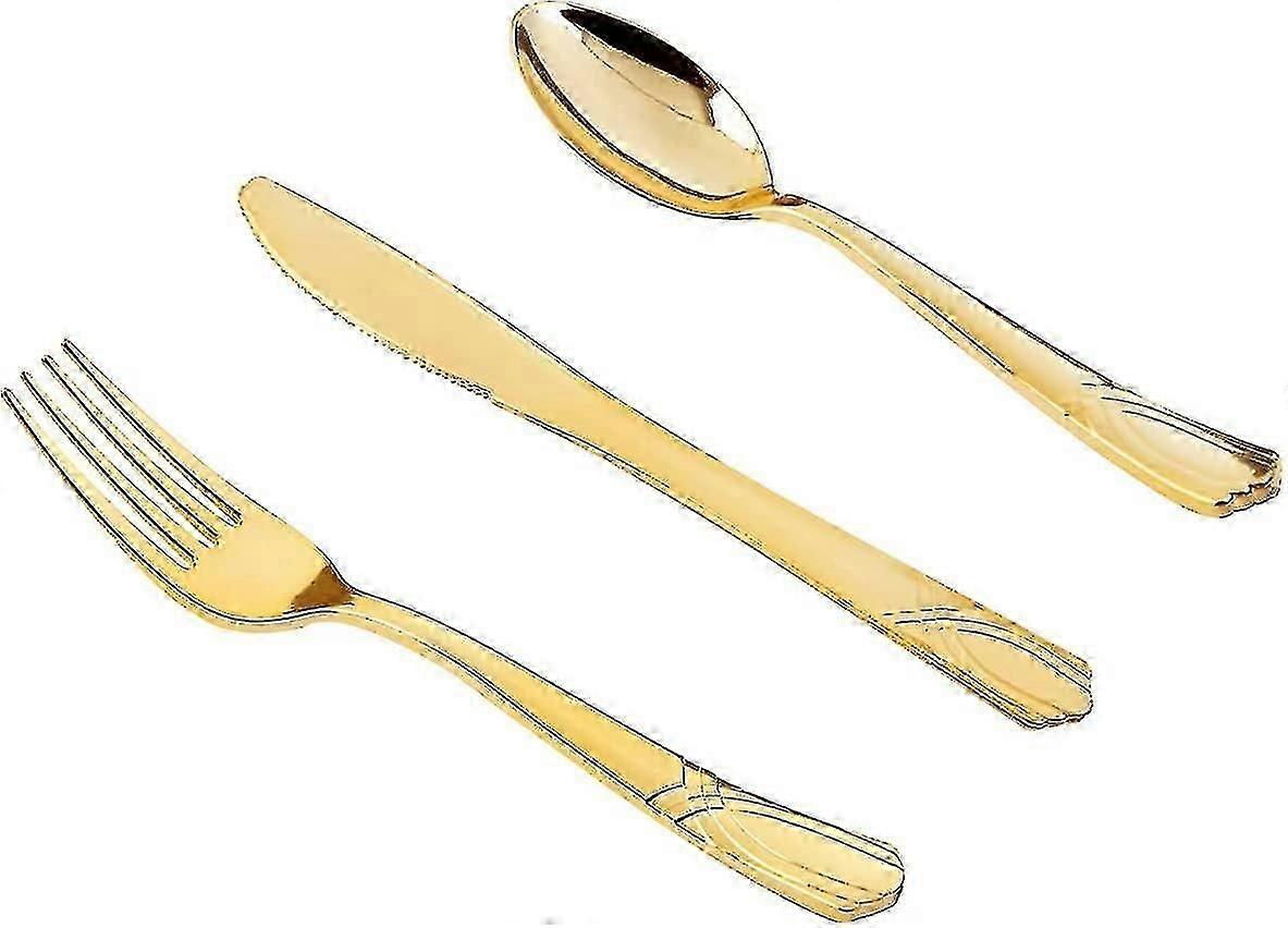 150 Gold Disposable Silverware Plastic Gold Cutlery Set - 50 Forks, 50 Knives, 50 Spoons - Gold Disposable Utensils Set Heavy Duty Edition 0126