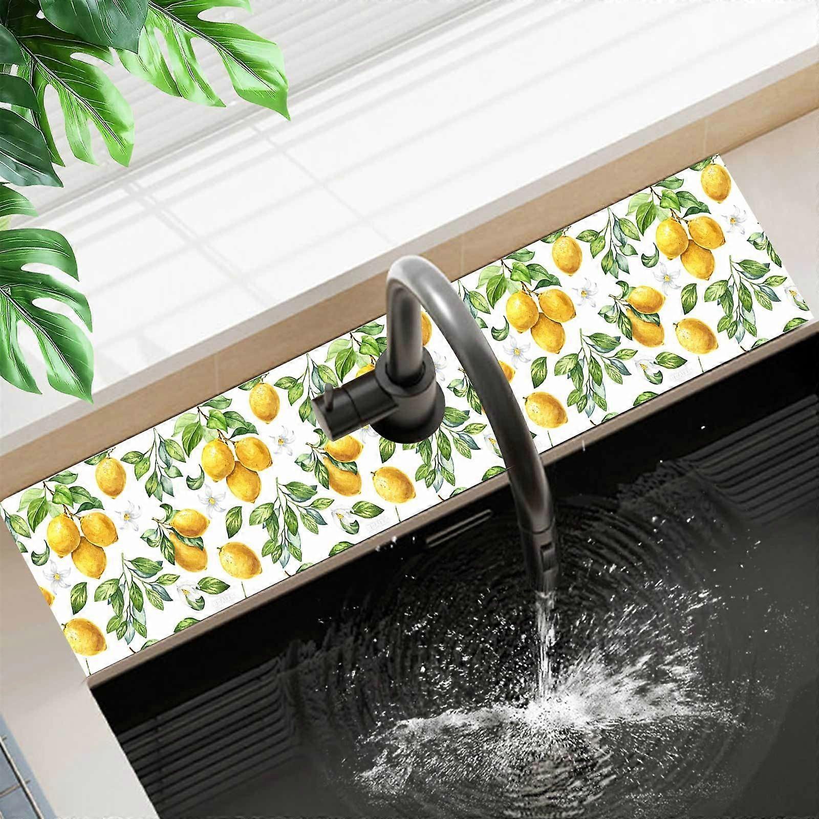 Yellow Lemon Leaves Fruit Faucet Draining Mat for Kitchen Sink, Dish Drying Mat for Kitchen Sink Splash Guard Behind Faucet Sink Mat, Super Absorben D
