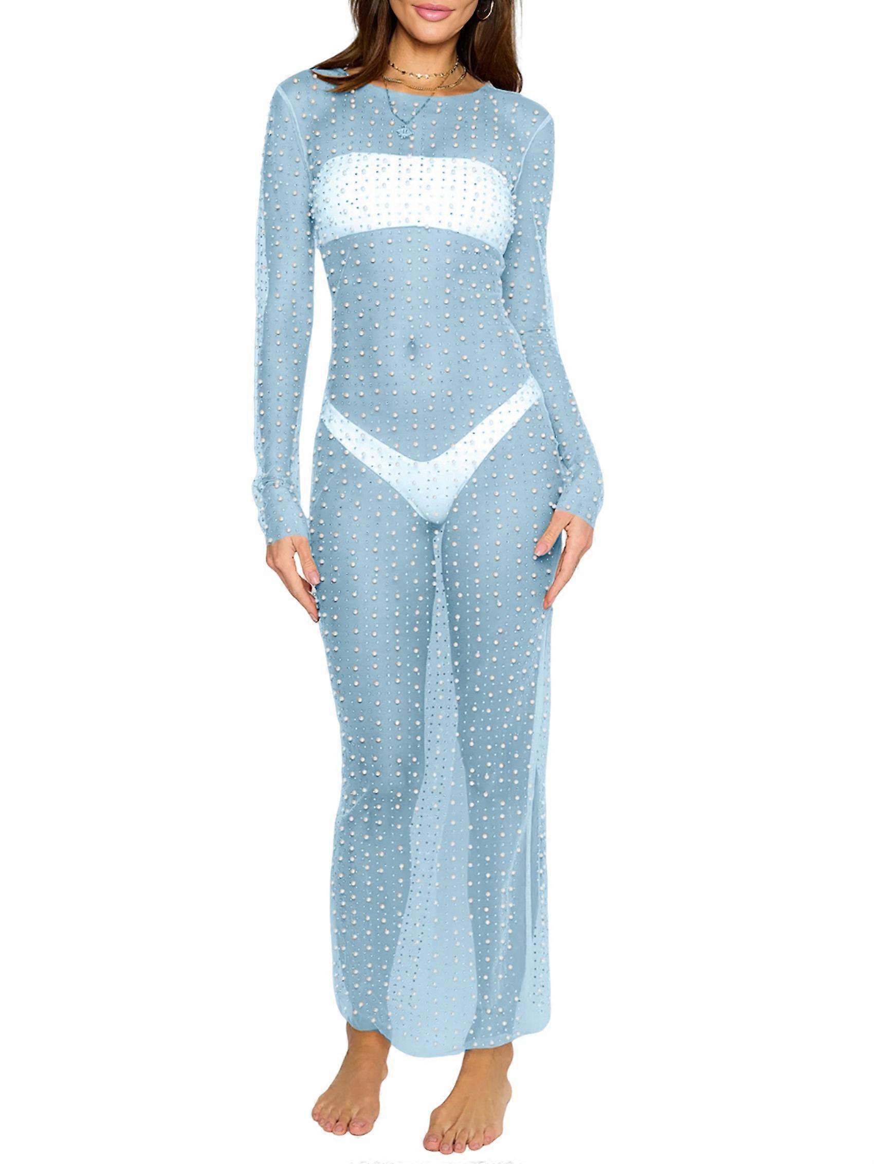 Women'S Sheer Mesh Pearl Rhinestone Cover Up Beach Dress Swimwear Bikini Swimsuit Bathing Suit Coverups Light Blue L