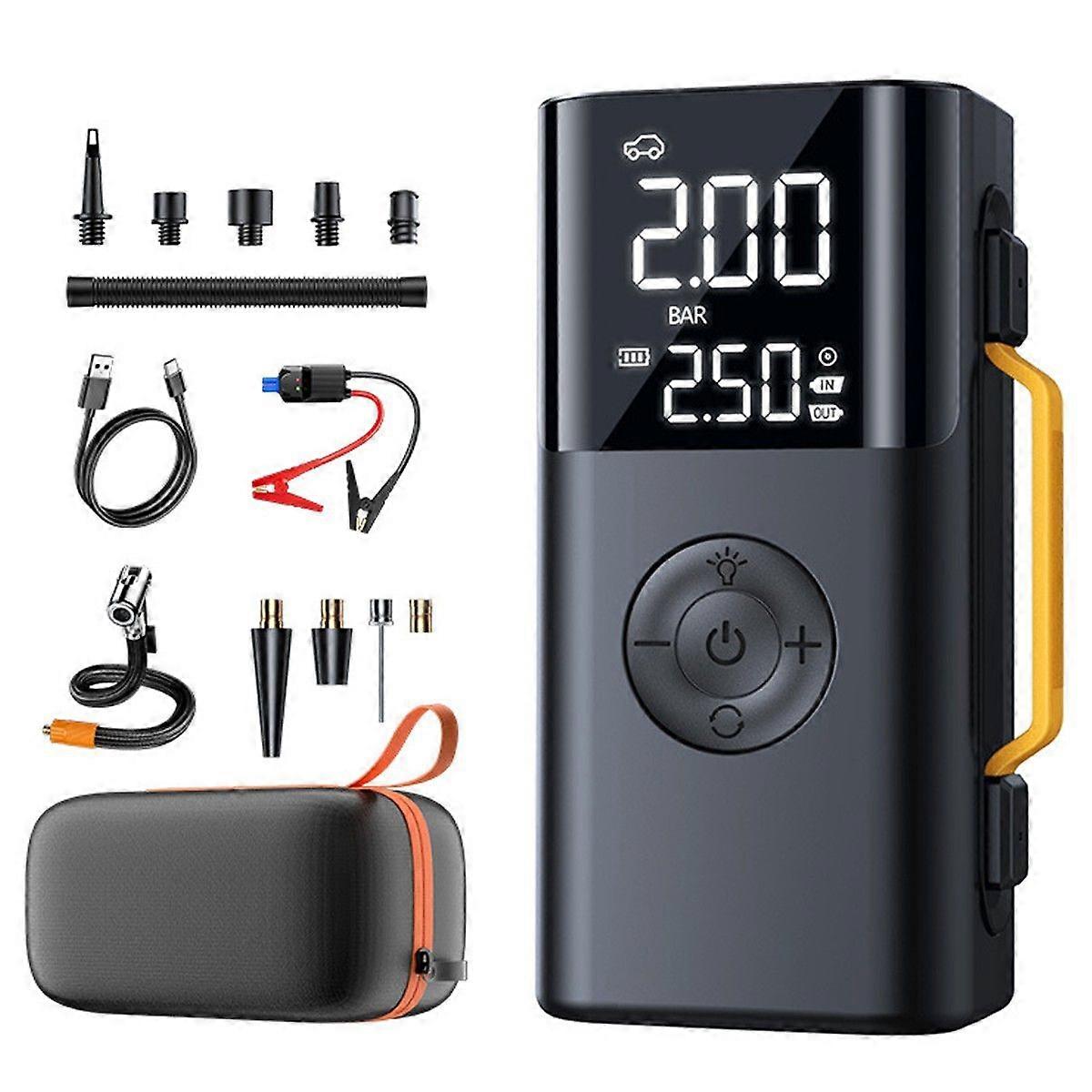 Your all-in-one roadside companion. This Portable Air Compressor & Jump Starter features a powerful emergency start function, digital tire pressure monitoring with auto-stop, a bright LED light with SOS mode, and a high-performance inflator for cars, bikes, and sports gear. Compact, durable, and designed for safety—ideal for daily drives and outdoor adventures. Key Features: Emergency Jump Start for Cold/Weak Batteries Quickly starts vehicles in low temperatures or when the battery is low, with advanced safety technology. Digital Tire Pressure Monitoring & Auto-Stop High-precision detection with PSI/KPA/BAR/KG/cm² unit switching. Set your target pressure and inflate automatically stops. Multi-Function LED Light + SOS Warning Bright flashlight for dark environments and an SOS strobe for emergency signaling. High-Performance Air Compressor Inflates car, motorcycle, bicycle tires, and sports balls quickly and accurately. Compact & Durable Portable Design Lightweight, fits easily in your trunk, and built for reliable daily or travel use. Ideal For: Emergency jump-starts and tire inflation on the road. Road trips, camping, cycling, and outdoor activities. Drivers seeking a compact, multi-function safety tool. Maintaining proper tire pressure for safety and fuel efficiency. Specifications: Power: Rechargeable lithium battery Display: Digital with pressure unit options Lighting: LED flashlight + SOS strobe Inflation: Auto-stop at preset pressure Portability: Compact, lightweight design