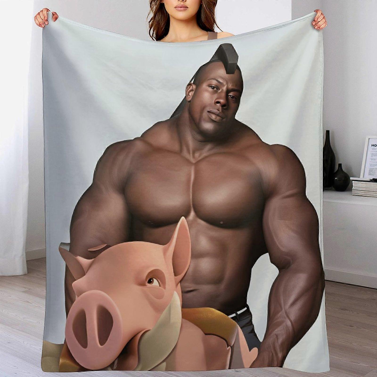 Muscular Man & Pig Print Flannel Blanket - Cozy Warm Throw | Whimsical Humorous Gift for Friends