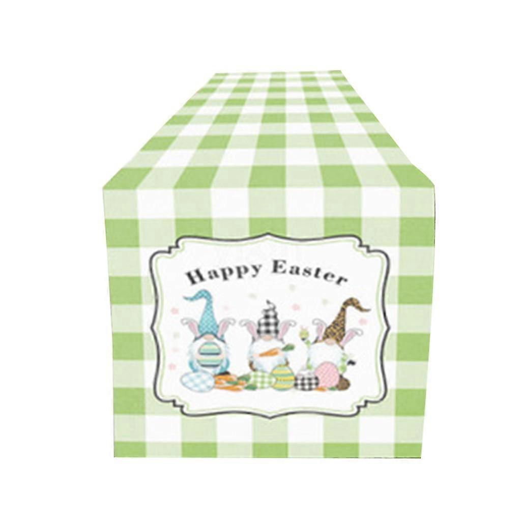 Tabletop cover for a home party, an Easter-gnome printed, cotton-linen table-runner and tablecloth.