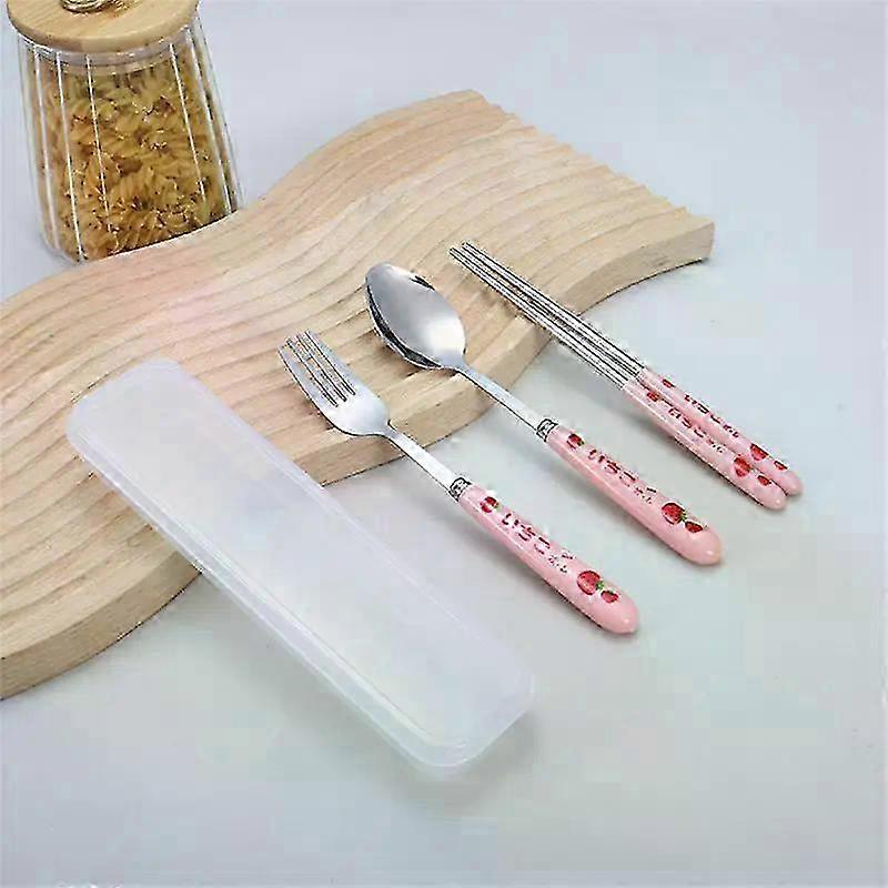 A Case For cute strawberry-Korean chopsticks, a travel and portable cutlery-set With a stainless steel fork and a spoon.