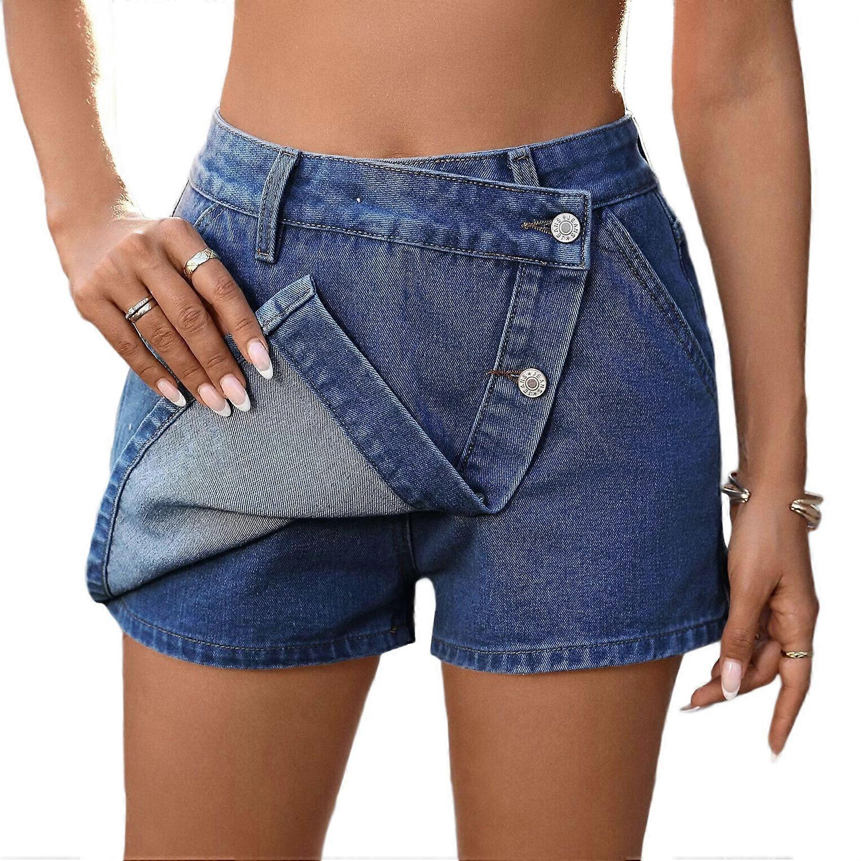 Women Casual High Waisted Solid Button Up Asymmetrical Denim Jean Skort Skirt Mini Shorts Deep Blue M