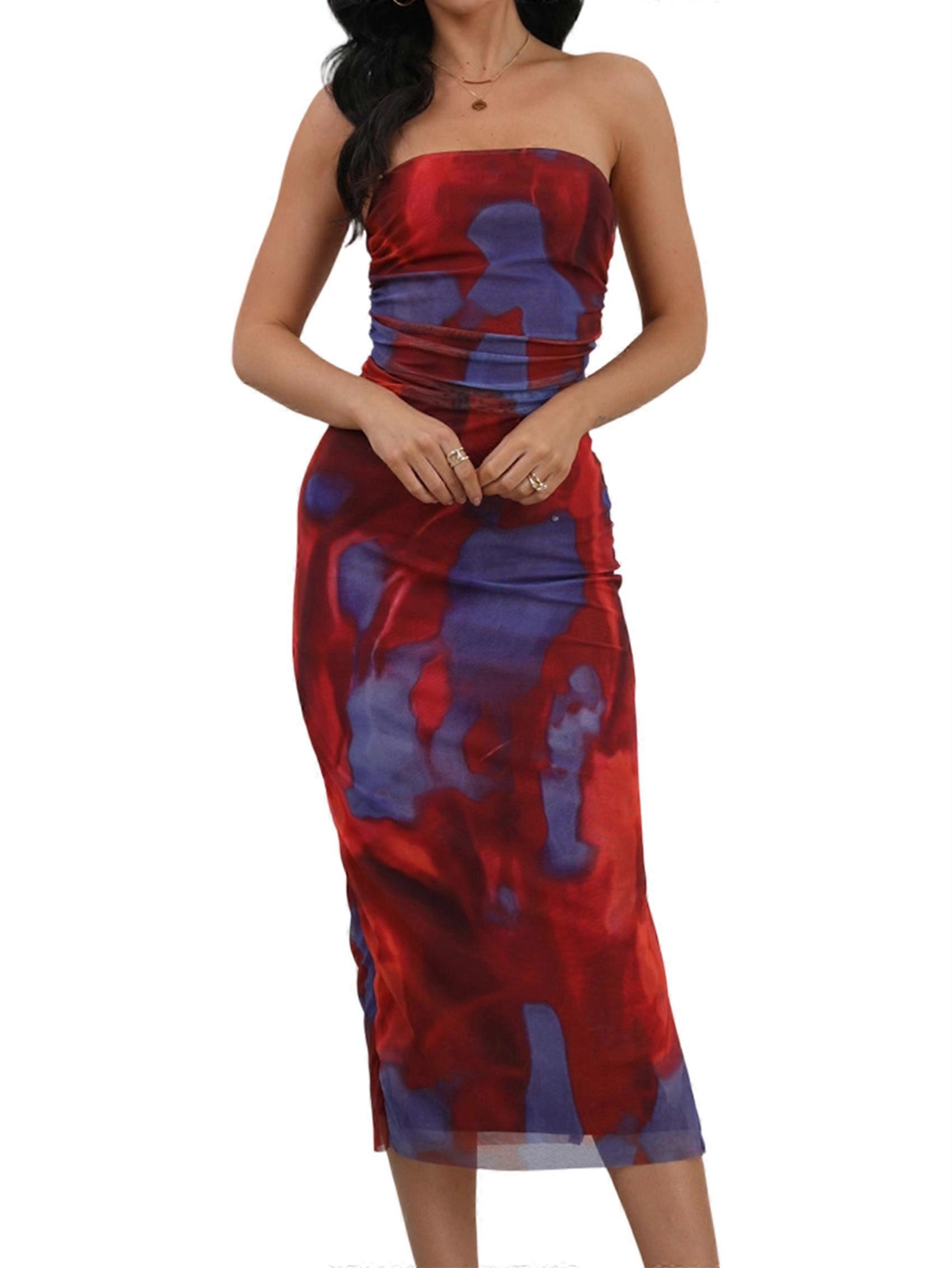 Womens Tie Dye Ruched Mesh Tube Dress Split Bodycon Cocktail Party Midi Sheath Dresses Brick Red M