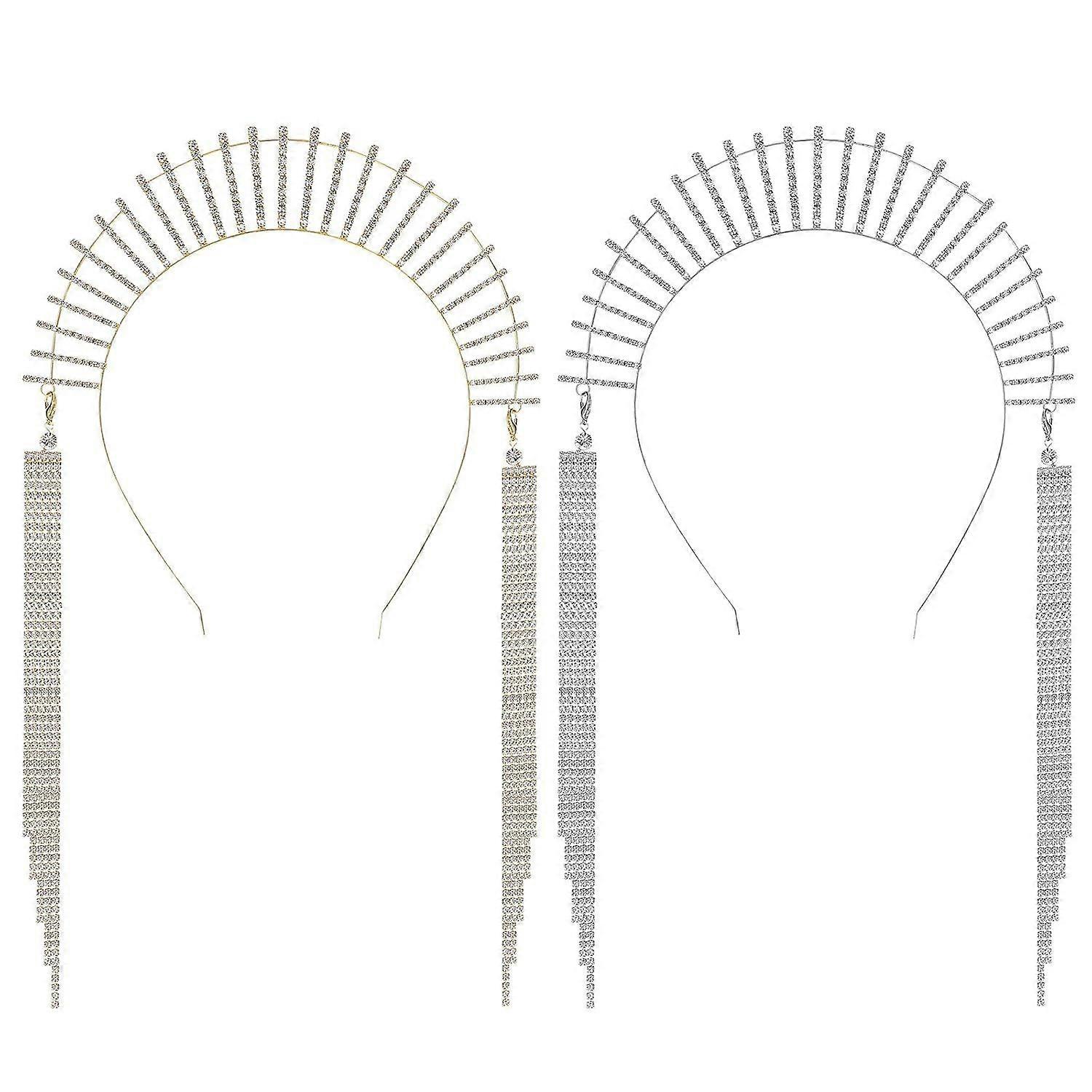 Rhinestones Circular Crown Headbands 2pcs with Tassel, Gold and Silver Wedding