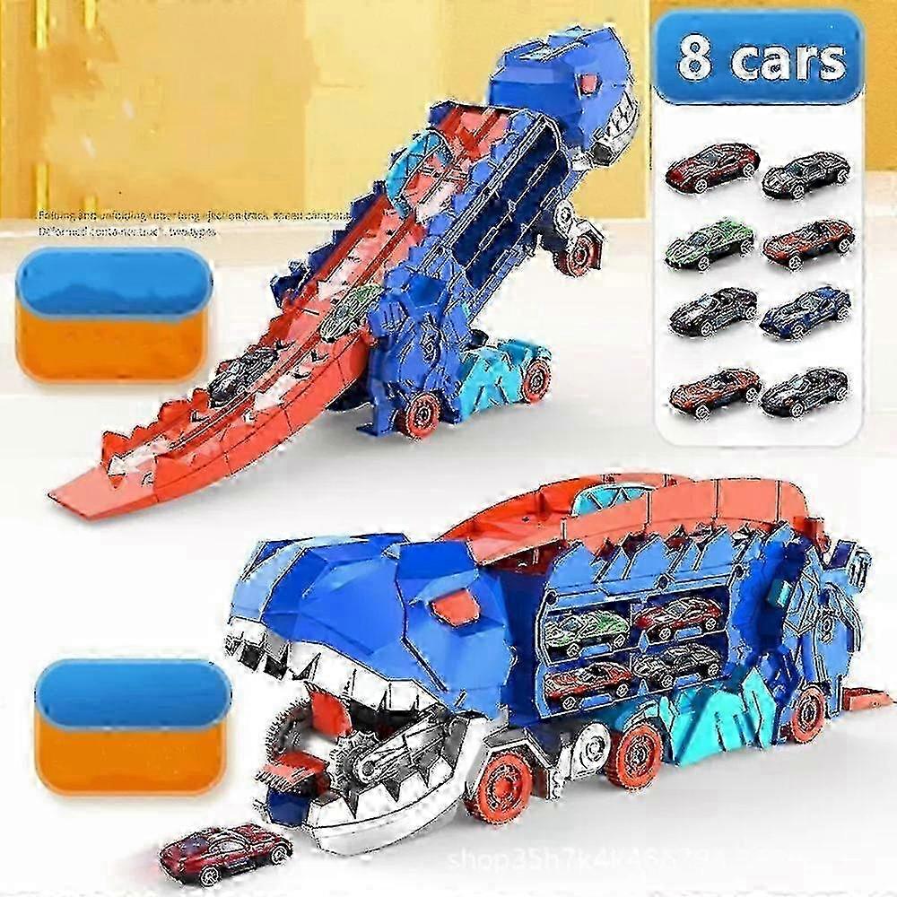 Dinosaur Transport Truck Toy with Foldable Sliding Race Track, Transforms into Standing T-rex, Ideal Birthday Gift for Boys & Girls
