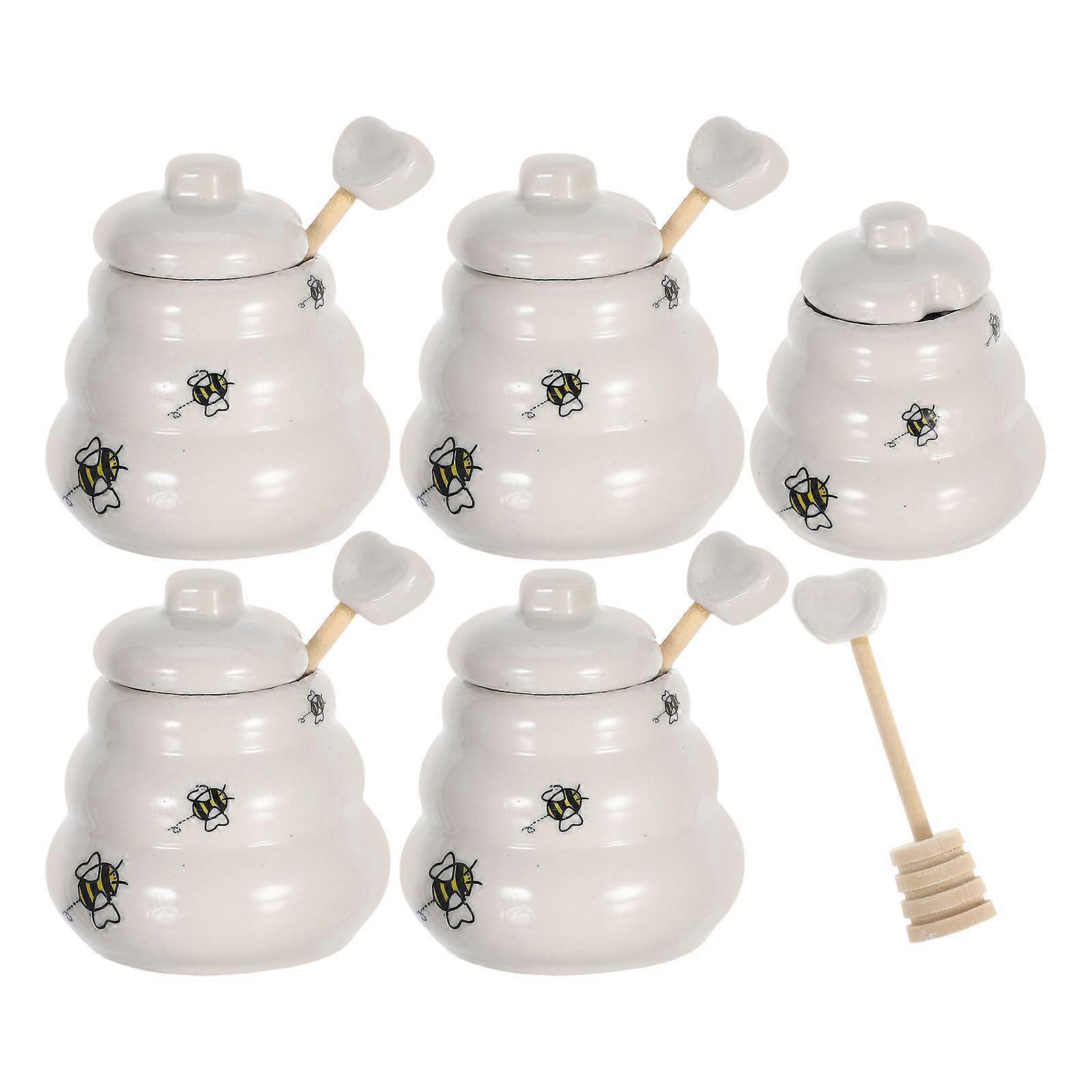 5PCS Ceramic Honey Pot Jar Set with Dipper and Lid for Home Kitchen Gift