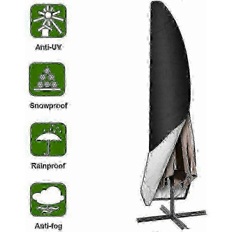 Usage Tips:Quality assured: made of 210D Oxford fabric, waterproof, durable, long-lasting, tear-resistant, anti-UV, fade-resistant, dust-proof Extra Large: The size of the parasol cover is 265 cm (50 x 70 x 40 cm) / 104 inches (19.7 x 27.6 x 15.7 inches), suitable for most cantilever parasols Safe fit and windproof: This sun protection cover is easy to put on andto be removed using a zipper. It has a drawstring at the bottom to tighten and prevent the cover from being blown away Application: Perfect for daily use in summer or for hibernation, protect your parasol from snow, frost, dust and sun Attention: This item is a COVER for the umbrella, it is not an umbrella Product Features Best protection every time It is sun protection clothing for outdoor umbrellas in summer. It is a coat for outdoor parasol in winter.It is waterproof for parasol on rainy days.Easy to use and store.Equipped with a zippered pocket for easy storage.Full protection against bad weather.Protect the parasol from bird droppings, tree sap and dirt. Oxford material with double stitched edges, abrasion resistant and durable.Note: 1. Please check the size of your parasol before purchasing.2. The size of the umbrella cover may be 1-5mm due to manual measurement.3. Only one umbrella cover included, umbrella and pole not included. Specification: Type: Garden Accessories.Materials: 210D oxford cloth Size: 265CM(50 x 70 x 40CM)/104inch(19.7 x 27.6 x 15.7inch) Weight: 271g Color: black Package: 1 x parasol cover 1 x storage bagThe side zipper and rust-proof storage pocket make it easy to store and use without taking up space.You can rinse it with a water hose or wipe it with a damp cloth, then dry it in the sun before next use.