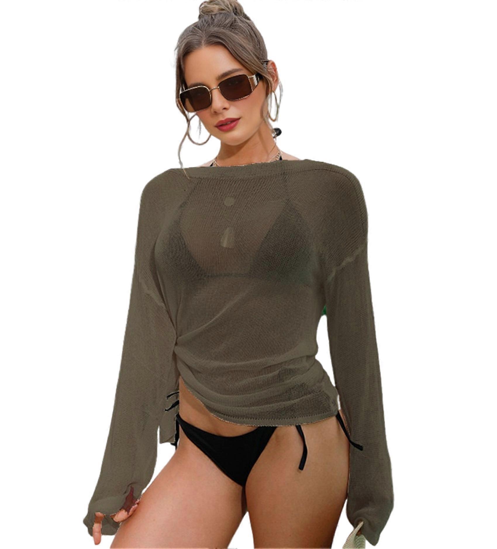 Women'S Long Sleeve T Shirts Bikini Swimsuit Beach Side Slit Tops Cover Up Deep Camel One Size