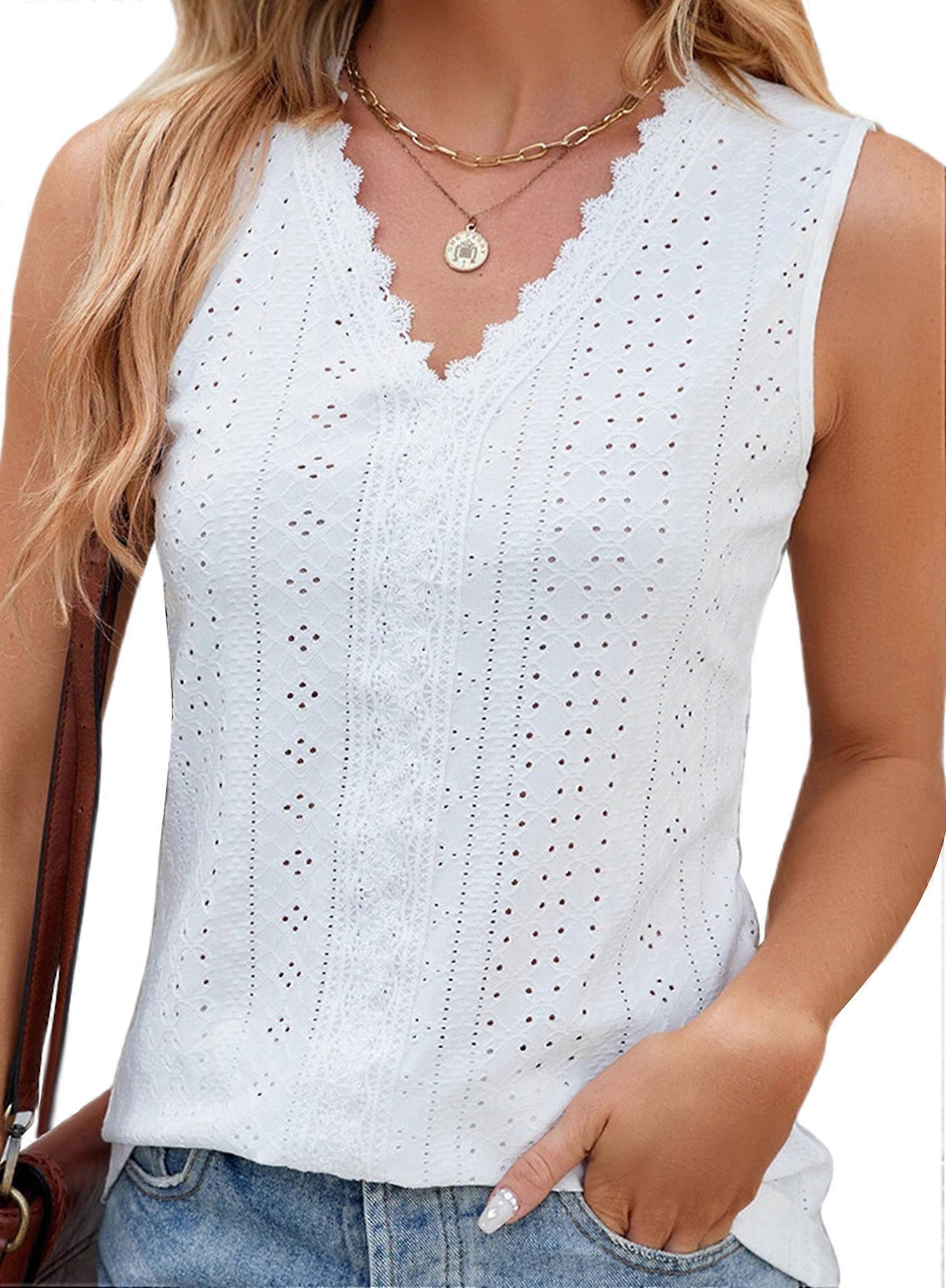 Women'S Trendy Tank Tops Eyelet Embroidery Sleeveless V-Neck Tank Shirts for Daily Casual White XL