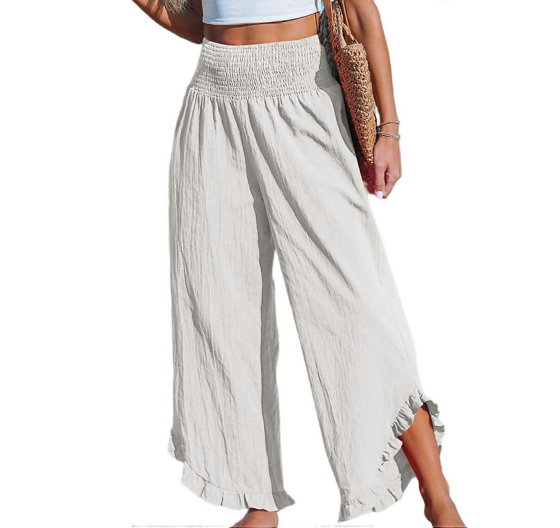 Women Pants Smocked Waist Straight Leg Ruffle Cuffs Loose Fit Casual Beach White M