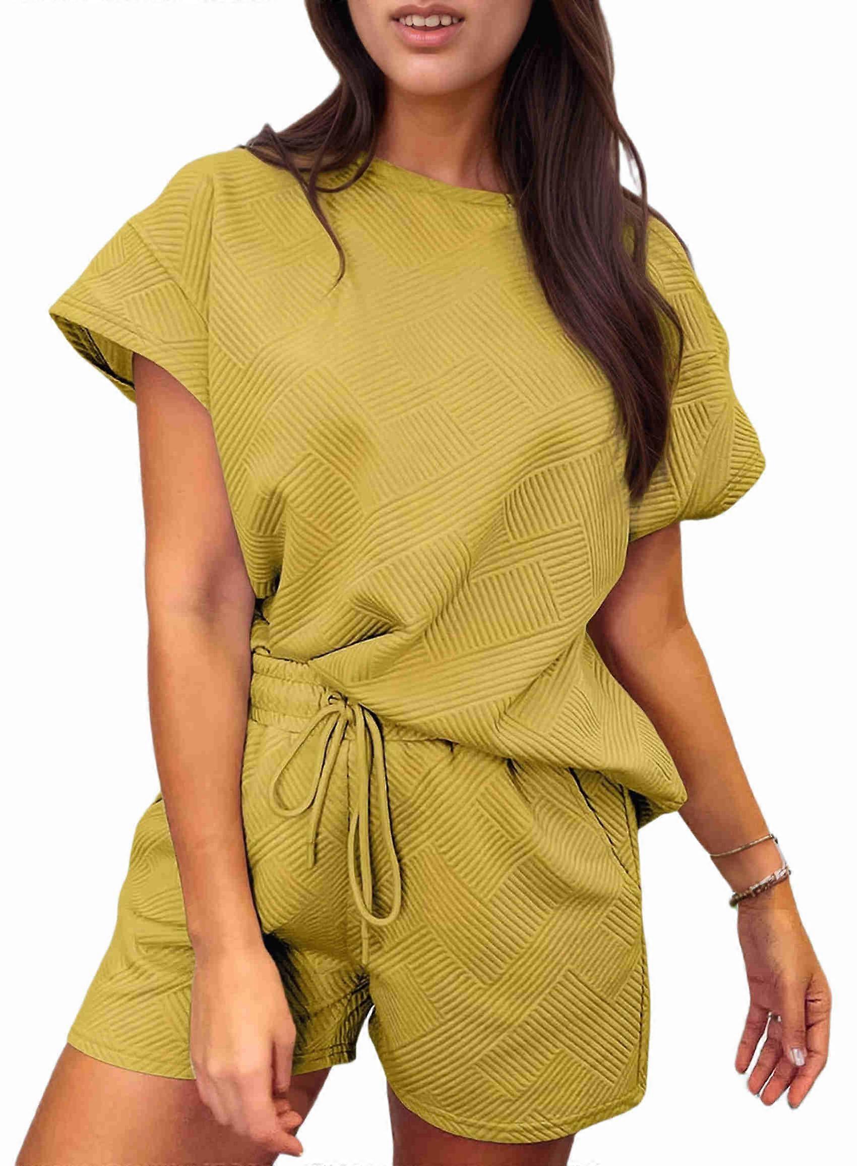 Women'S 2 Piece Solid Color Round Neck Casual Textured Fabric Short Sleeve Pajamas Sweatsuit Set Yellow XXL