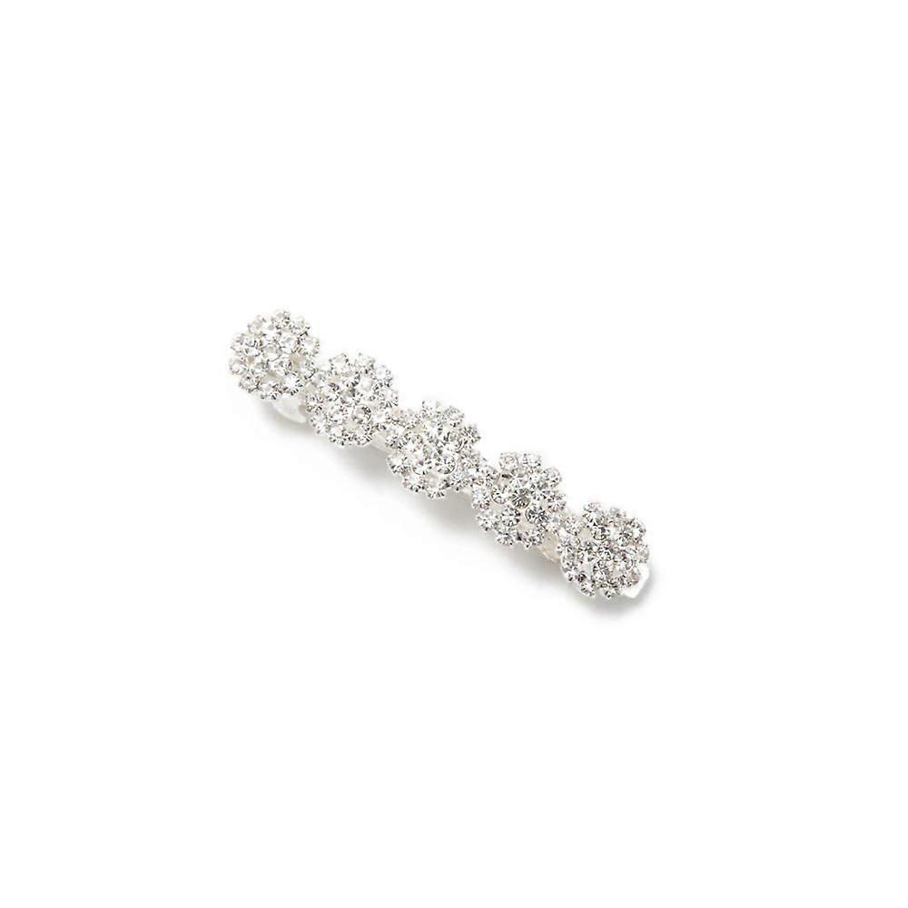 Five sparkling floral clusters of round crystals framed by square set stones add refined dazzle while holding hair in place. The decorative panel measures 2 1/4 inches long by 1/3 inch and mounts on a French barrette back for secure, comfortable wear. Key benefits Visible sparkle without bulk: Clustered round crystals with square set accents create a bright, multi dimensional look that elevates any hairstyle. Reliable hold: French barrette closure provides a secure grip for sections of hair, keeping styles in place through daily activities. Low profile sizing: Compact dimensions fit easily into half updos, side swept styles, or as an accent on a ponytail. Product details Decorative design: Five flower motifs composed of round crystal centers surrounded by square set stones. Size: 2 1/4 inches long by 1/3 inch . Closure: French barrette back for dependable fastening and easy use. Finish and materials: Sparkling crystal stones set in a finished hardware mount. Handle with care to preserve stone settings. Practical applications Special occasions: Add polished sparkle to formal hairdos for weddings, parties, and events. Everyday styling: Dress up work or casual looks by clipping back a section of hair for a neat, finished appearance. Quick touch ups: Use to secure bangs or side sections when you need a fast, attractive fix. Care tips Wipe gently with a soft, dry cloth and avoid prolonged exposure to moisture or harsh chemicals to maintain shine.