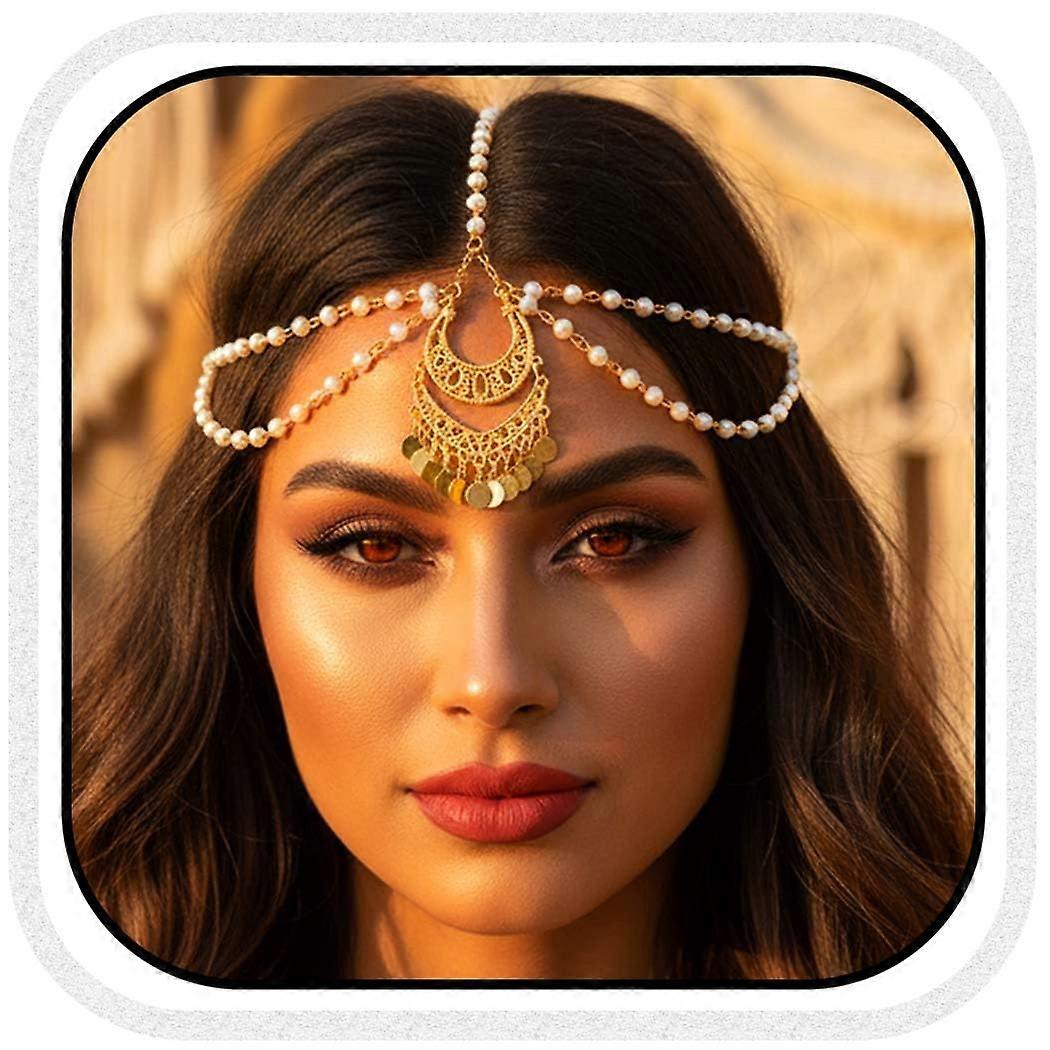 Gold Headpiece Head Chain for Women A lightweight, adjustable gold head chain designed to add refined detail to festival, costume, and special occasion hairstyles. Combining pearl and alloy elements with decorative crystals, rhinestones, sequins, and floral accents, this headpiece adapts to a range of styles from beach boho to vintage and baroque. Key benefits Versatile styling: Easily complements beach boho, royal vintage, baroque luxury, belly dance, and costume looks without complex styling. Comfortable for all day wear: Lightweight construction and a smooth alloy finish make it comfortable to wear during events and performances. Secure and adjustable fit: Approximate length 20.07 inches with a 3.93 inch extension chain to fit different head sizes and hair arrangements. Durable decorative finish: Pearls and pendants are set to maintain appearance with normal use and avoid rapid fading. Ready for many occasions: Designed to enhance party, prom, festival, Halloween costume, and performance outfits. Materials and construction Main materials: alloy base with pearl accents. Decorative elements: crystal, rhinestones, sequins, faux flowers, leaves, and turquoise style accents used selectively for visual interest. Size and fit: size with an adjustable extension chain for a customized fit across different head sizes and hairstyles. Wearability: lightweight and balanced to sit comfortably on the forehead or crown depending on styling choice. How it solves common problems Simplifies styling by providing an instant statement accessory that works with multiple hair types and lengths. Avoids heavy or clumsy accessories by using a lightweight design that stays in place during movement. Offers flexibility for lastminute costume or outfit adjustments thanks to the adjustable chain and adaptable shape. Suggested use scenarios Festival or concert look: Wear the head chain with loose waves or braids for a boho festival outfit. Costume and performance: Pair with belly dance or Halloween costumes to add sparkle and vintage flair that moves with you. Formal events and prom: Style over an updo or halfup hairstyle to introduce subtle luxury to evening wear. Care tips Store flat or hanging to maintain shape. Avoid prolonged exposure to liquids or heavy sweat to preserve decorative finishes. Gently wipe with a soft, dry cloth if needed. This headpiece offers a versatile, comfortable way to elevate a wide range of looks while providing an adjustable fit and decorative detail suited for events, performances, and everyday styling.